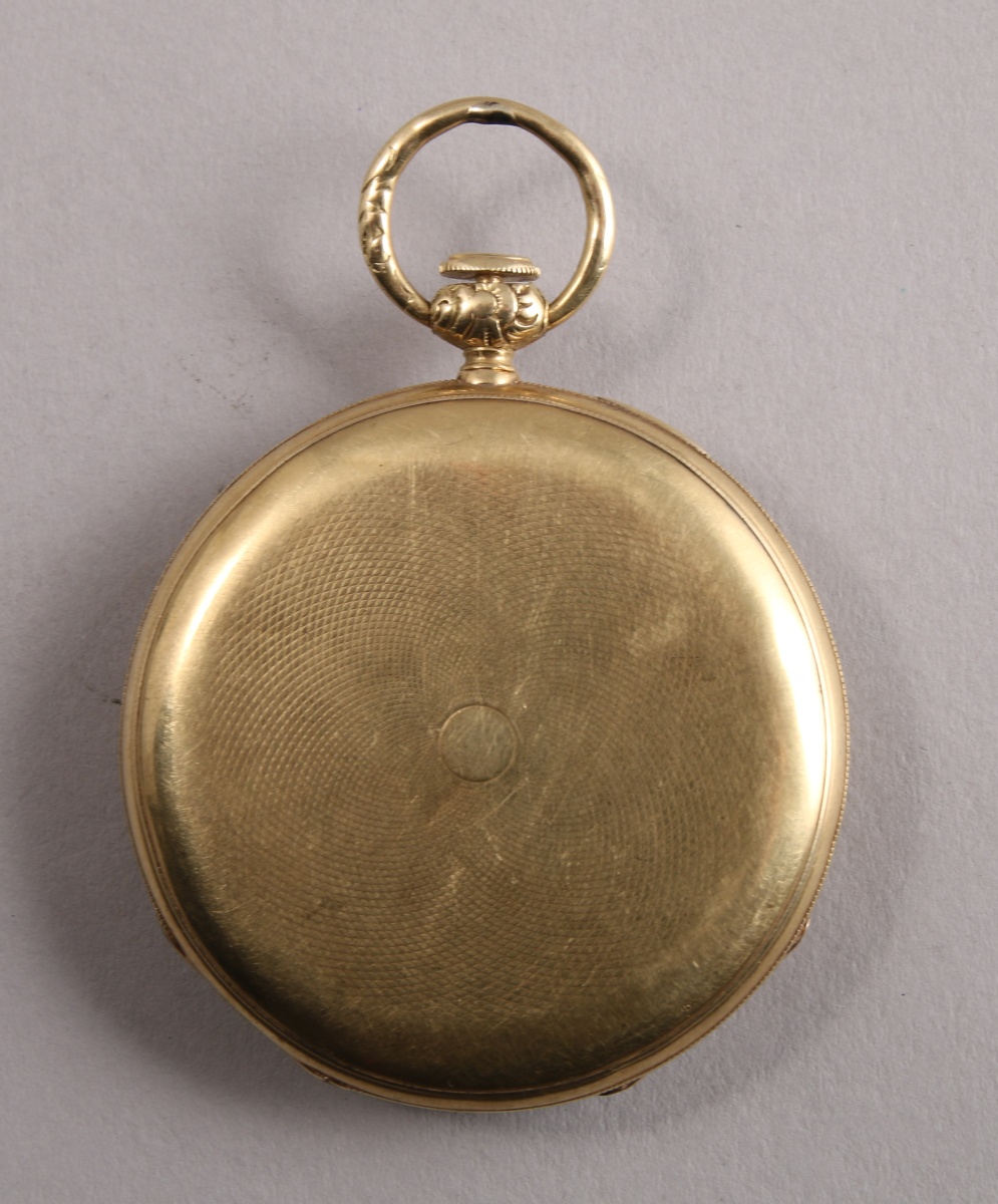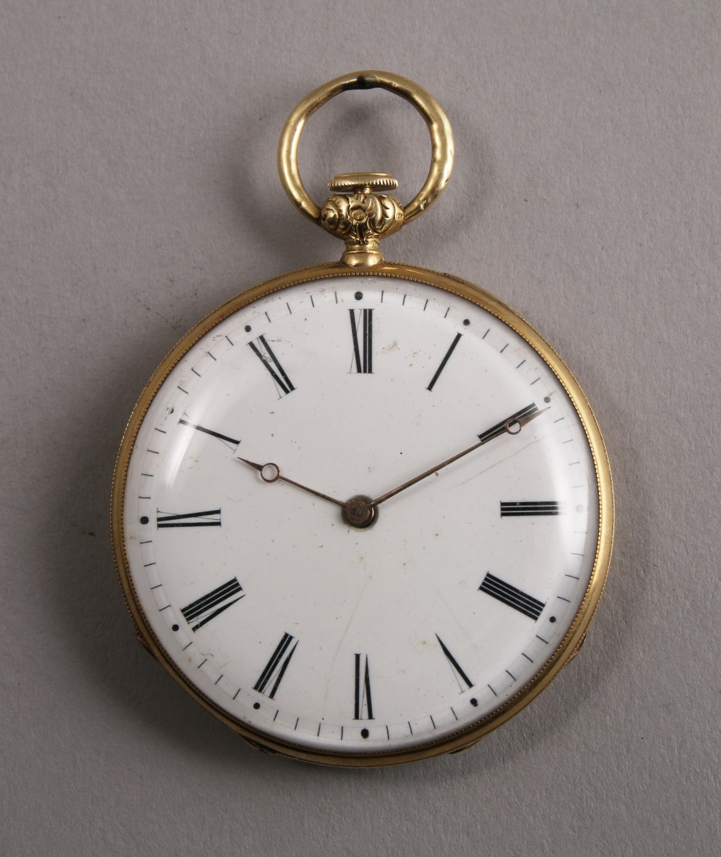 Belle MONTRE de GOUSSET PLATE à SONNERIE en or jaune, à clé, le boitier finement guilloché. Le cadran émaillé gradué avec les heures en chiffres romains. le cache poussière en or jaune maqué "échappement cylundre en pierre huit trous à rubis".