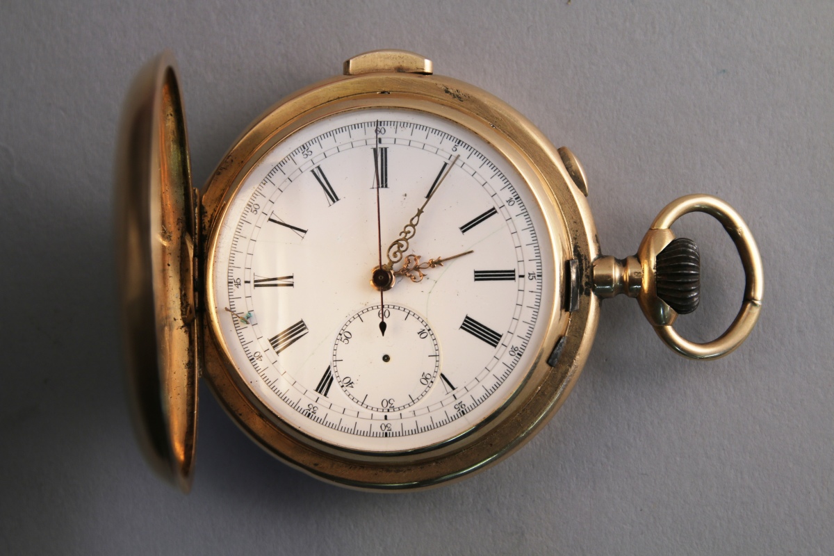 Spectaculaire CHRONOGRAPHE de GOUSSET à SONNERIE et RÉPÉTITION des minutes en or jaune et remontoir à 12 heures. Double cadran émaillé gradué avec les heures en chiffres romains et les aihuilles or (manque la troteuse des secondes). Le cache poussière en or marqué des distinctions remporté par l'horloger, numéroté 201757 et marqué "répétition à minutes, 32 rubis chronographe, système silencieux".