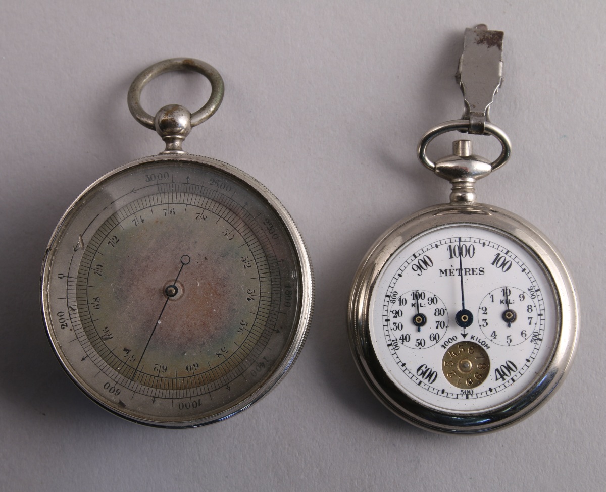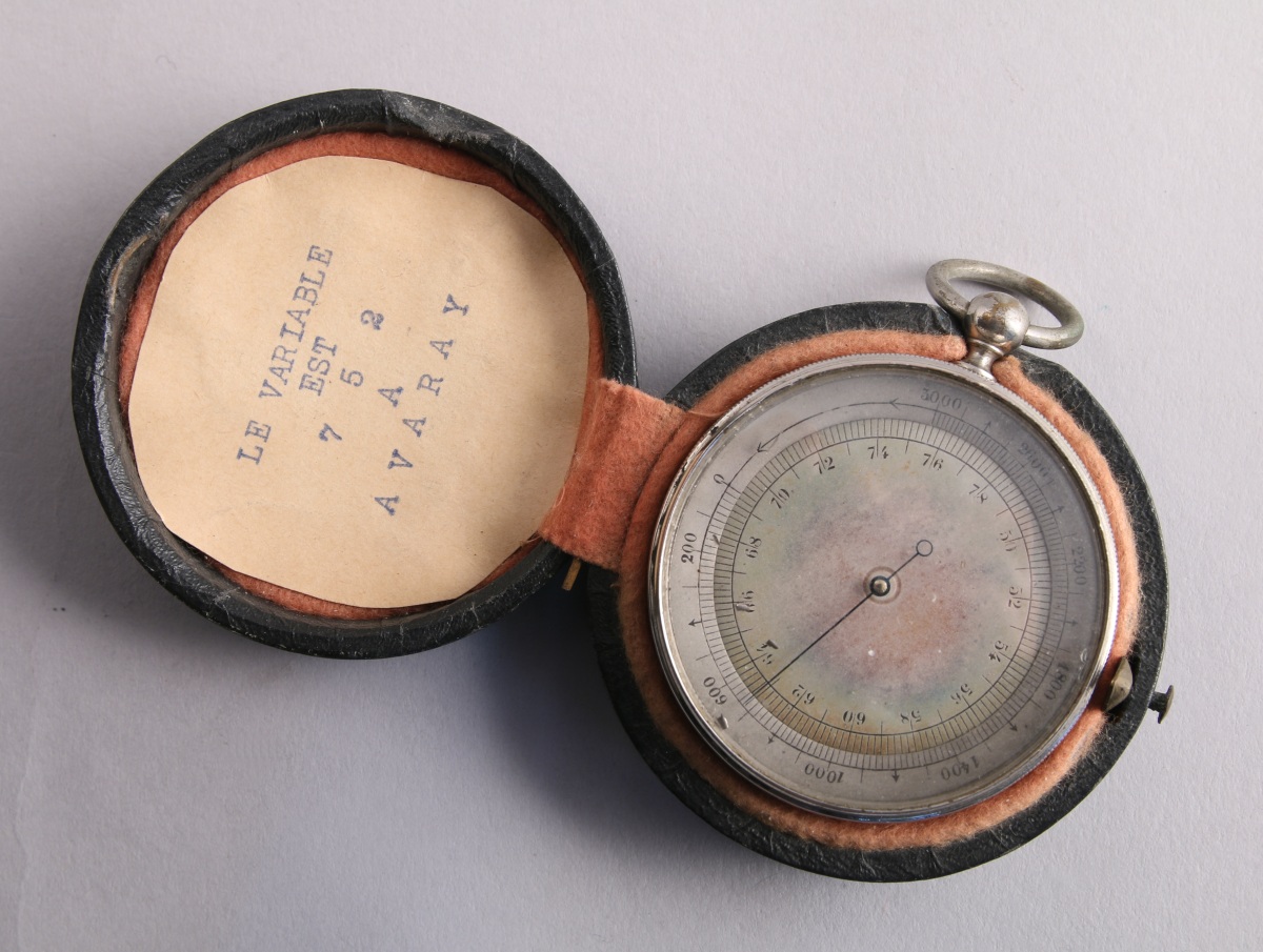 Rare BAROMÈTRE ALTIMÉTRIQUE, ou altimètre, en métal dans une boîte contenant un papier tapuscrit: "LE VARIABLE / EST / 752 / A / AVARAY" et un autre INSTRUMENT de MESURE datant des débuts de l'aviation.