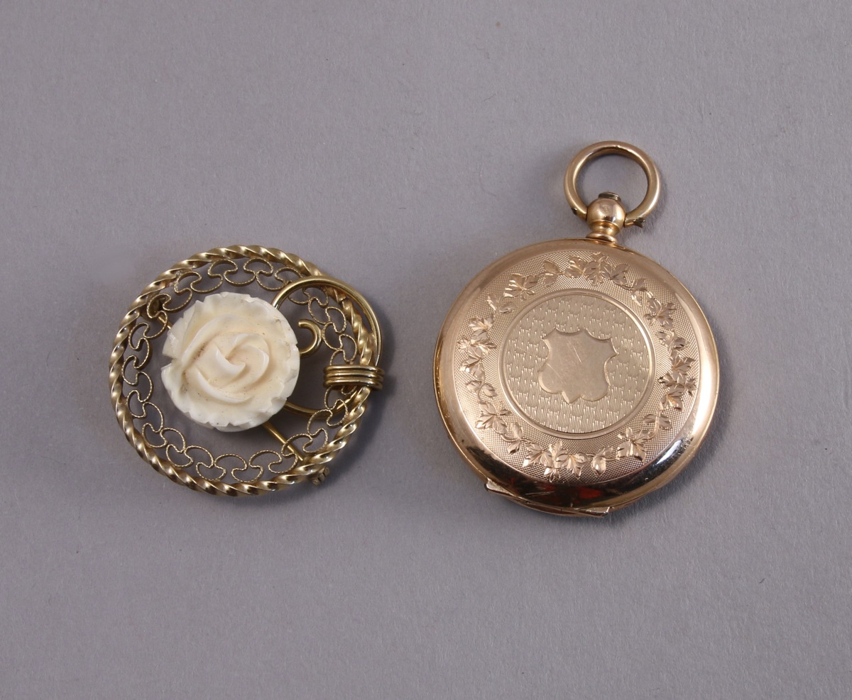 JOINT: BROCHE de forme circulaire en or jaune 12k centrée d'une fleur. Poids brut: 4,1 g.