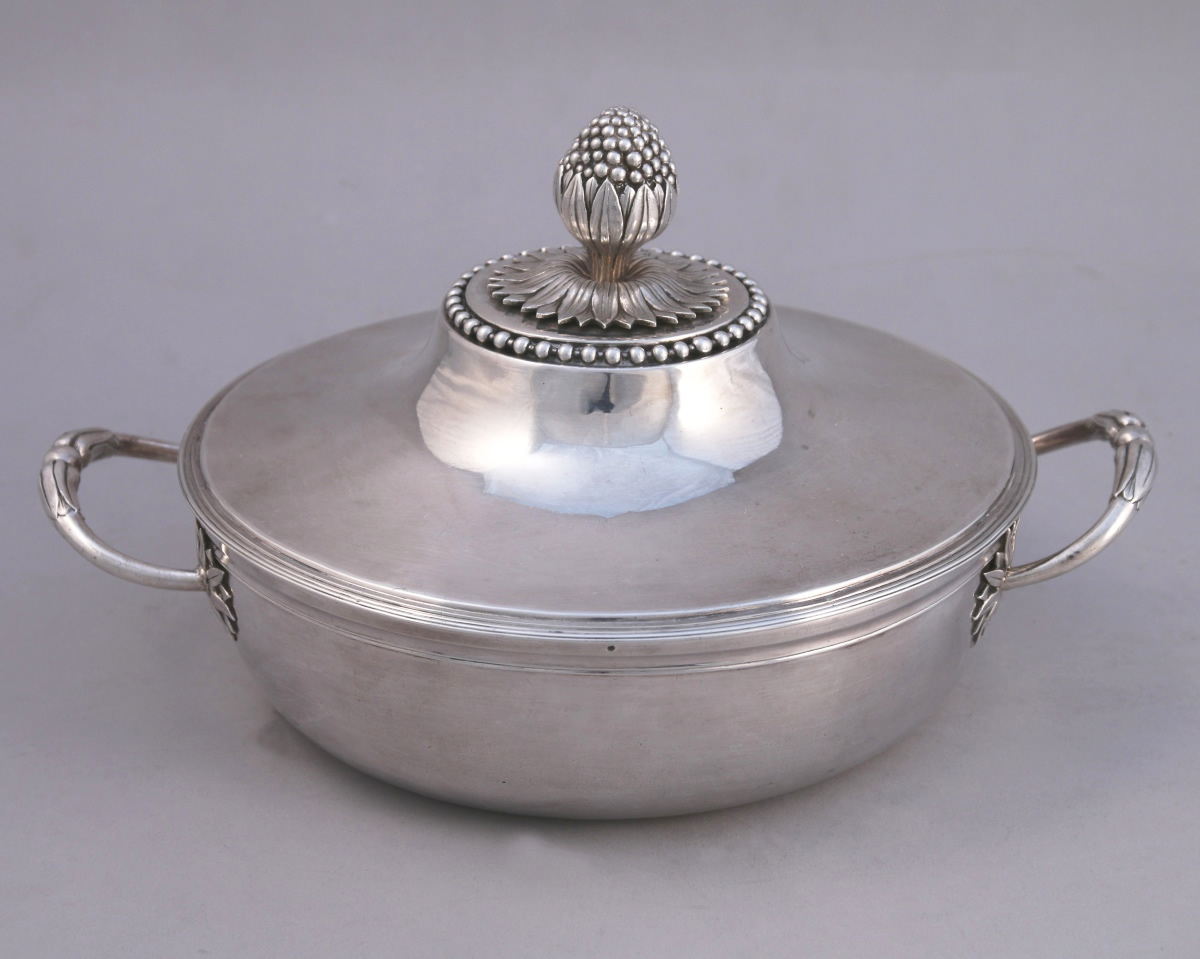 PARIS. LÉGUMIER couvert en argent. Anses latérales à attaches fleuronnées. Couvercle à doucine appliqué d'un rais de perles. Le fretel en graine reposant sur une terasse de feuilles lancéolées rayonnantes. Le couvercle et le corps gravés des armoiries de la famille de Samson (Maine) timbrées d'une couronne marquisale et supportées par des lions.