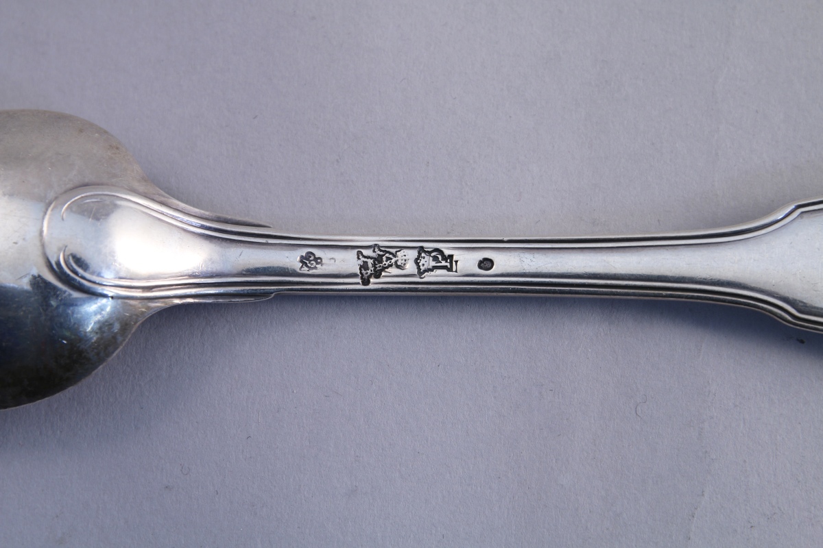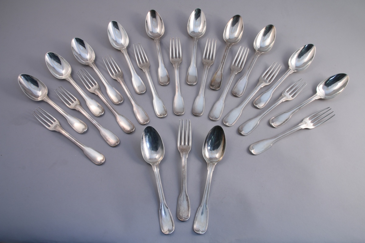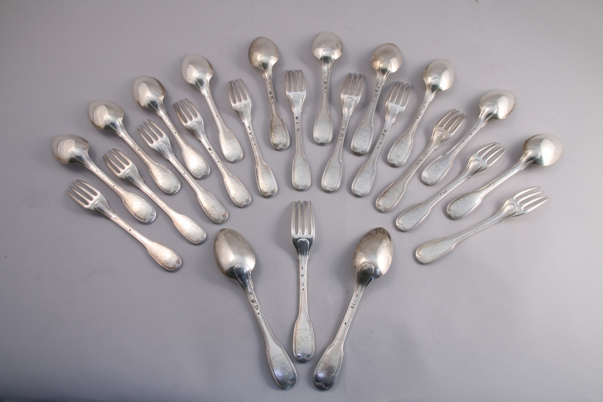 PARIS. Rare suite de 12 COUVERTS, modèle filet-contour, en argent. Les spatules gravées d'armes d'alliance soutenues par des lions et timbrées d'une couronne de marquis.