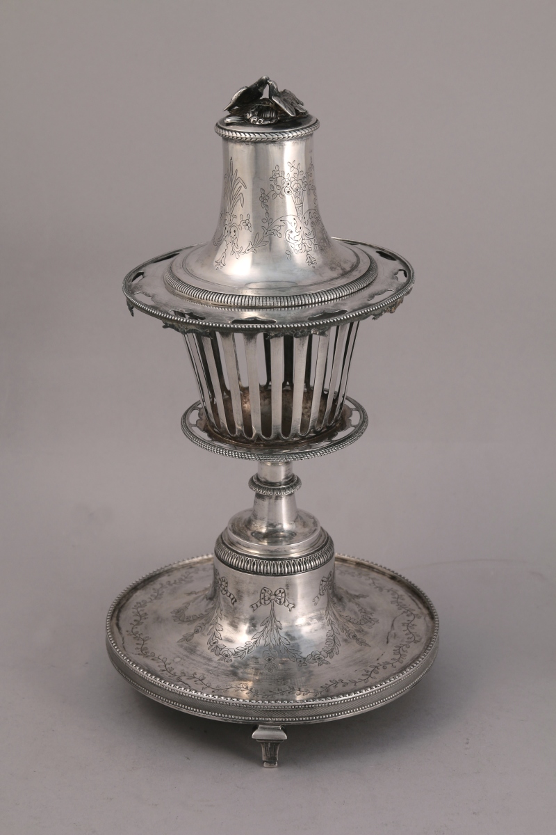 PARIS. CONFITURIER en argent reposant sur une base circulaire tripode ornée de guirlandes de fleurs rubanées. Le corps ajouré de motifs oblongs cerclé de douze emplacements pouvant accueillir autant de cuillères. Le couvercle à décor de vases fleuris, roseaux et enroulements feuillagés sommé d'une prise figurant deux colombes amoureuses.