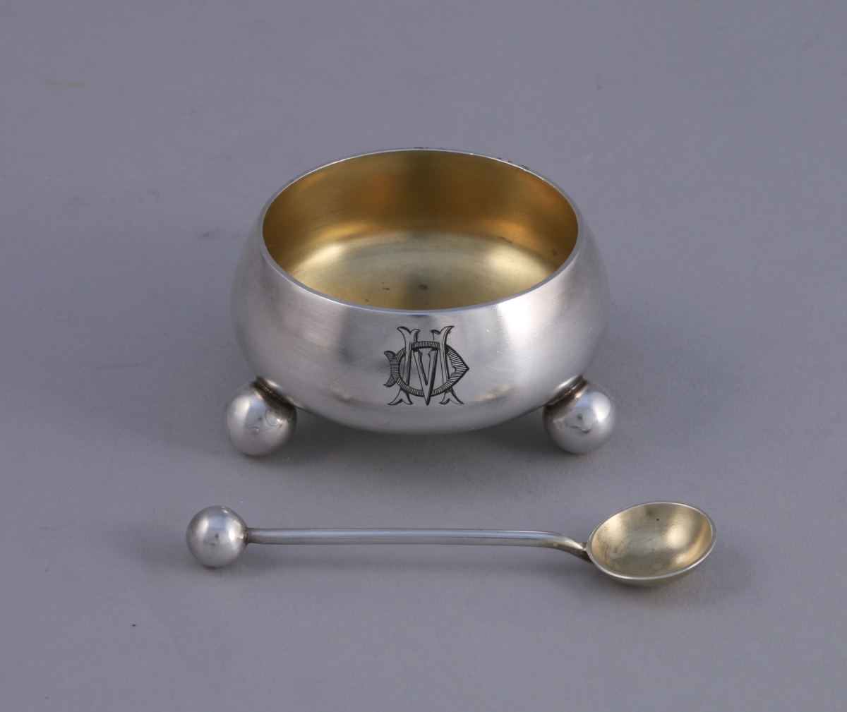 ROYAUME-UNI. MAPPIN & WEBB. Suite de 6 SALERONS de forme ronde en argent. Le corps monogrammé "MD", l'intérieur vermeillé. Reposent sur trois pieds boule. Avec CINQ PELLES À SEL. Écrin.