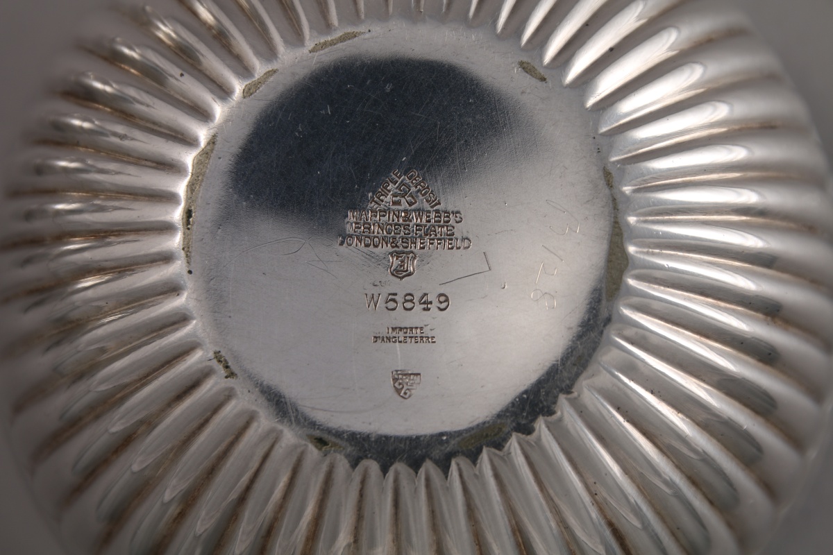 ROYAUME-UNI. MAPPIN & WEBB. Service de 3 PIÈCES en métal argenté composé: d'un spectaculaire SAMOVAR, le corps de forme ovoïde orné de godrons et joncs rubanés à hautes anses latérales à attaches feuillagées. Le couvercle à doucine sommé d'une toupie. Il repose sur quatre pieds griffe godronnés réunis par une entretoise recevant le réchaud. Le robinet adopte la forme d'une palmette en bois exotique sculpté; d'un SUCRIER de forme ronde godronné et d'une petite BOUTEILLE godronnée. Les trois pièces gravées d'un tortil de baron.