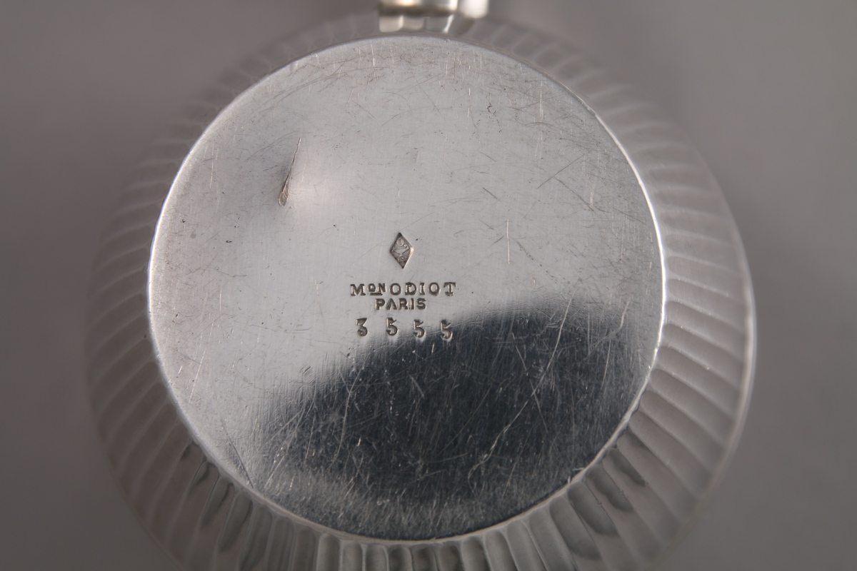 On joint une THÉIÈRE avec son piètement à réchaud en métal argenté et un pot-à-lait en argent. Les deux pièces gravées du même tortil de baron. Maître-orfèvre: Odiot.
