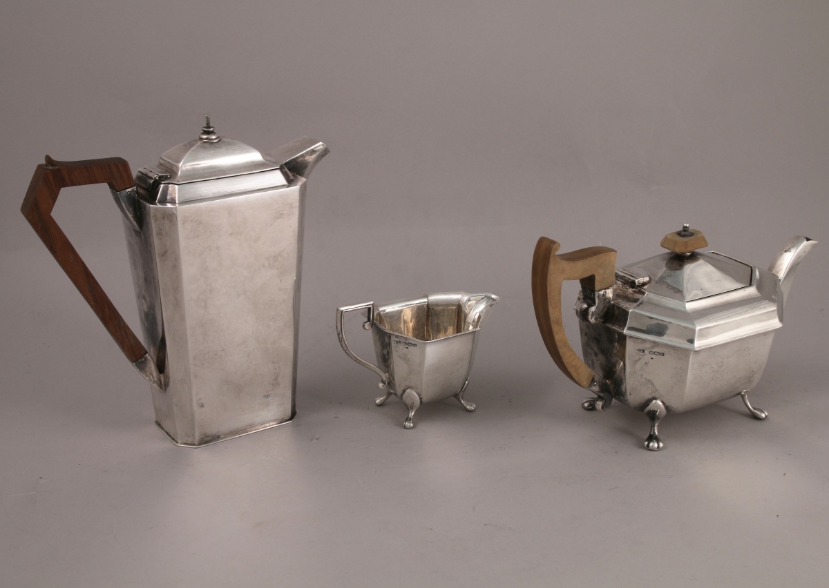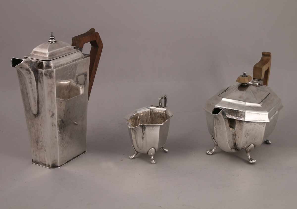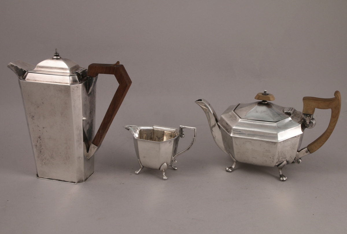 ROYAUME-UNI. Partie de SERVICE à THÉ, DEUX PIÈCES, en argent uni à pans. Reposent sur quatre pieds en patte de lion. Il se compose d'une théière (anse et fretel en bois) et d'un pot-à-lait.