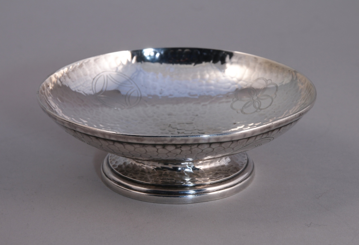 U.S.A. TIFFANY & Co. COUPE de forme ronde en argent martelé à décor japonisant de kamons à l'intérieur et à l'extérieur. Bord ourlé. Elle repose sur un piédouche. Monogrammme "MCS" sous ce dernier. Signée et numérotée 4504M10012.