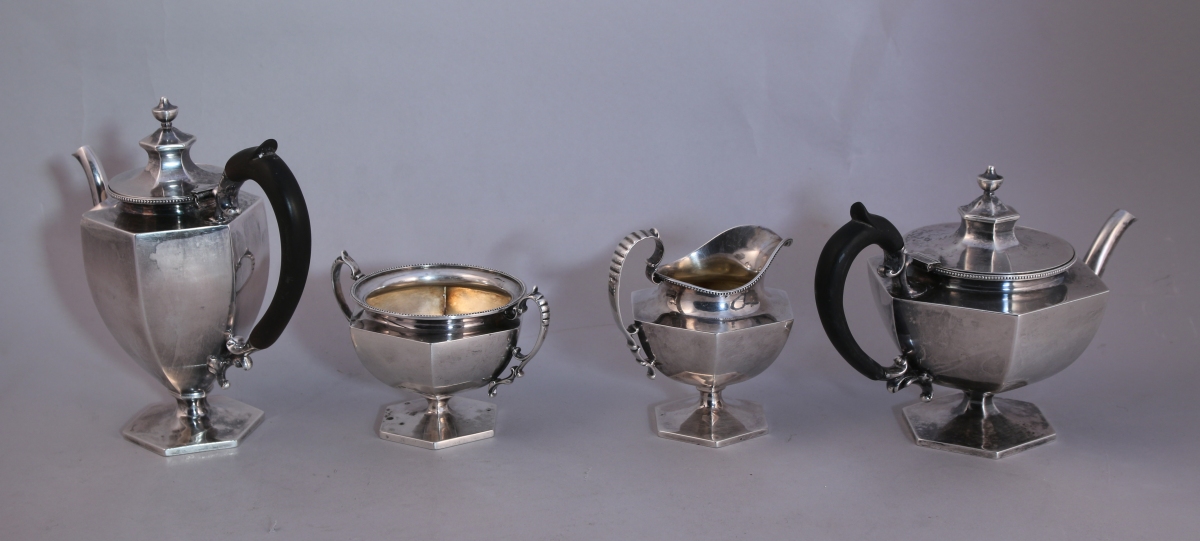 U.S.A. SERVICE à THÉ-CAFÉ dit égoïste en argent, 4 PIÈCES, à pans et côtes saillantes reposant sur un piédouche hexagonal. Les cols soulignés d'un rais de perles. Anses en bois noirci. Il se compose d'une cafetière, d'une théière, d'un sucrier et d'un pot-à-lait.
