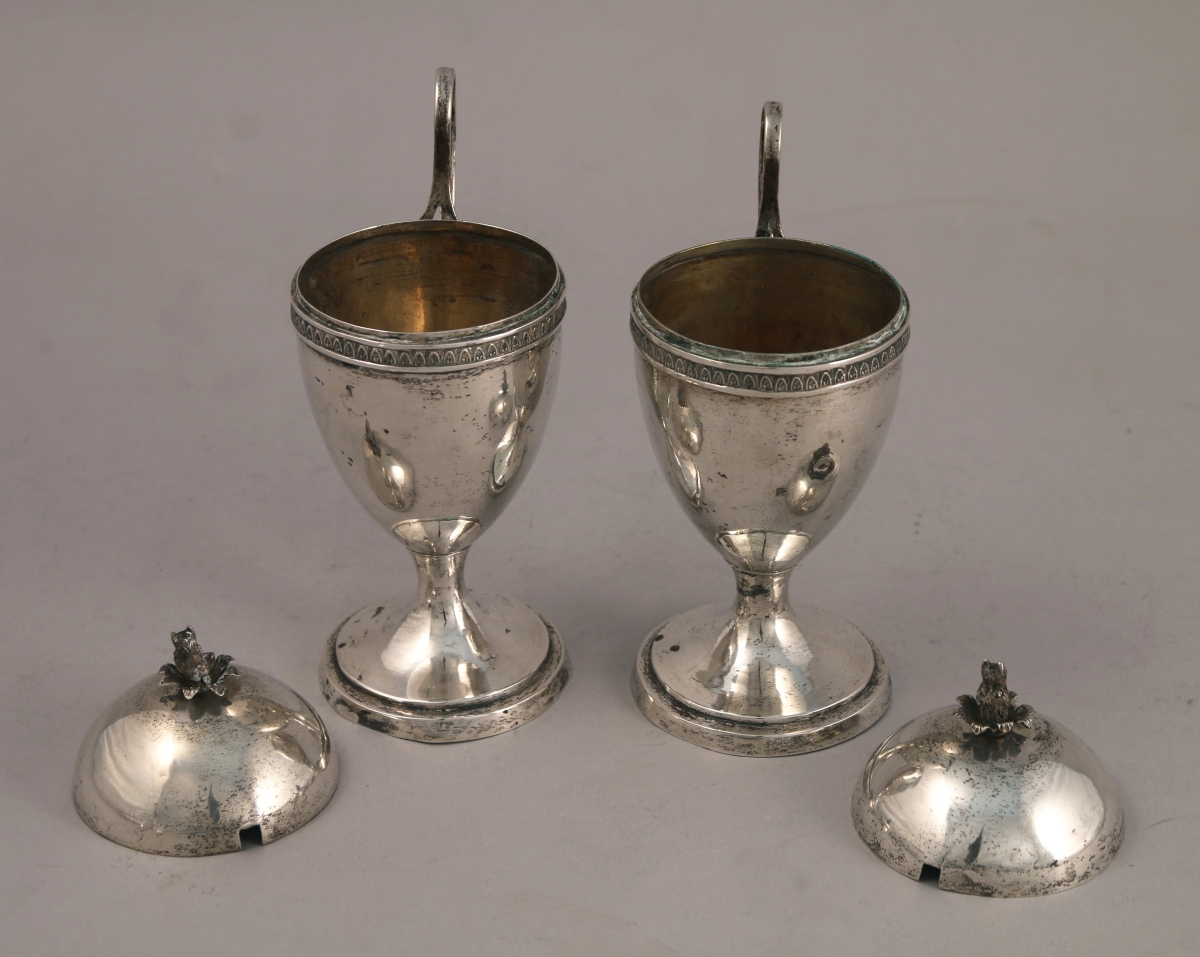 EUROPE. Paire de TASSES COUVERTES de forme ovoïde en argent. Le col souligné d'une frise de palmettes. Anse haute. Le fretel figurant un hibou dans des feuillages. Elle reposent sur un piédouche.
