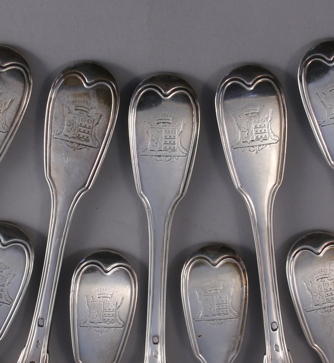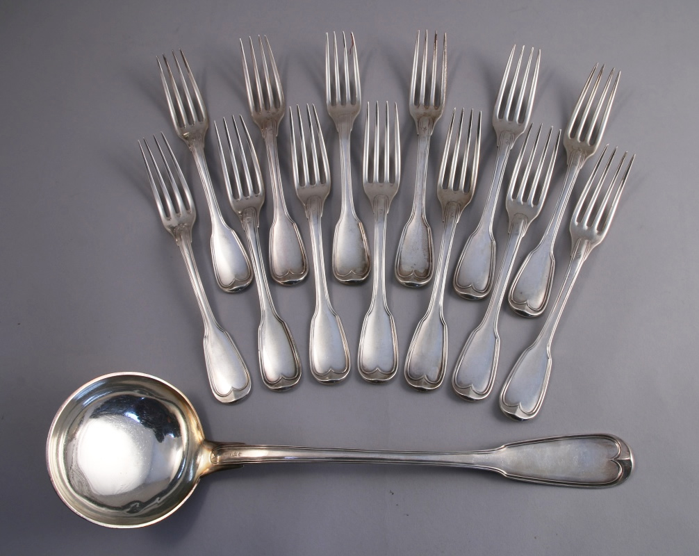 Suite de 12 FOURCHETTES et d'une LOUCHE, modèle filet-contour, en argent. Les spatules gravées d'armes d'alliance des familles La Verteville et de La Motte Saint-Pierre timbrées d'une couronne comtale.