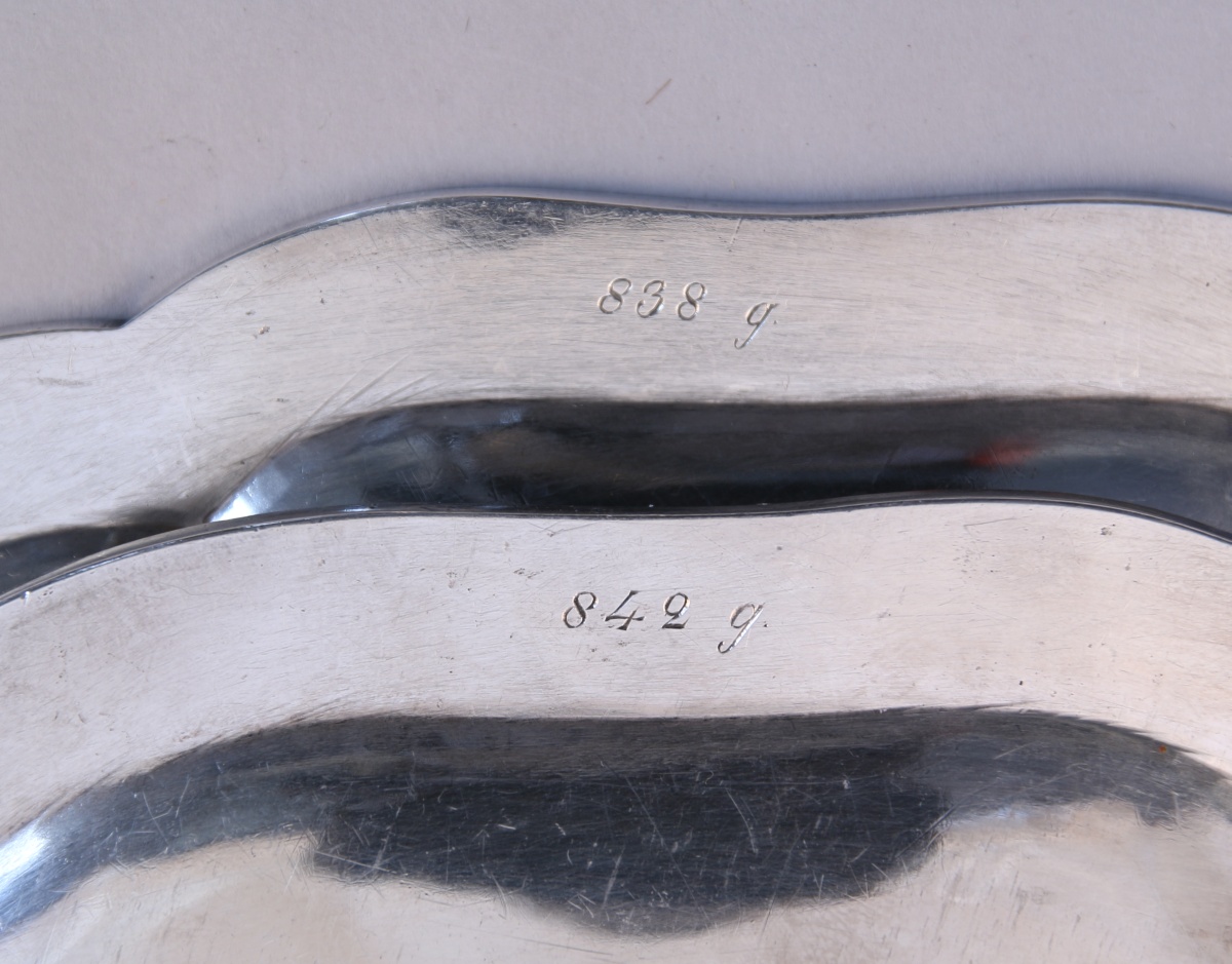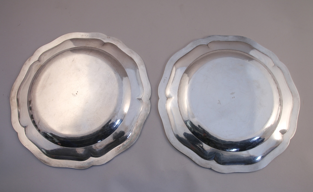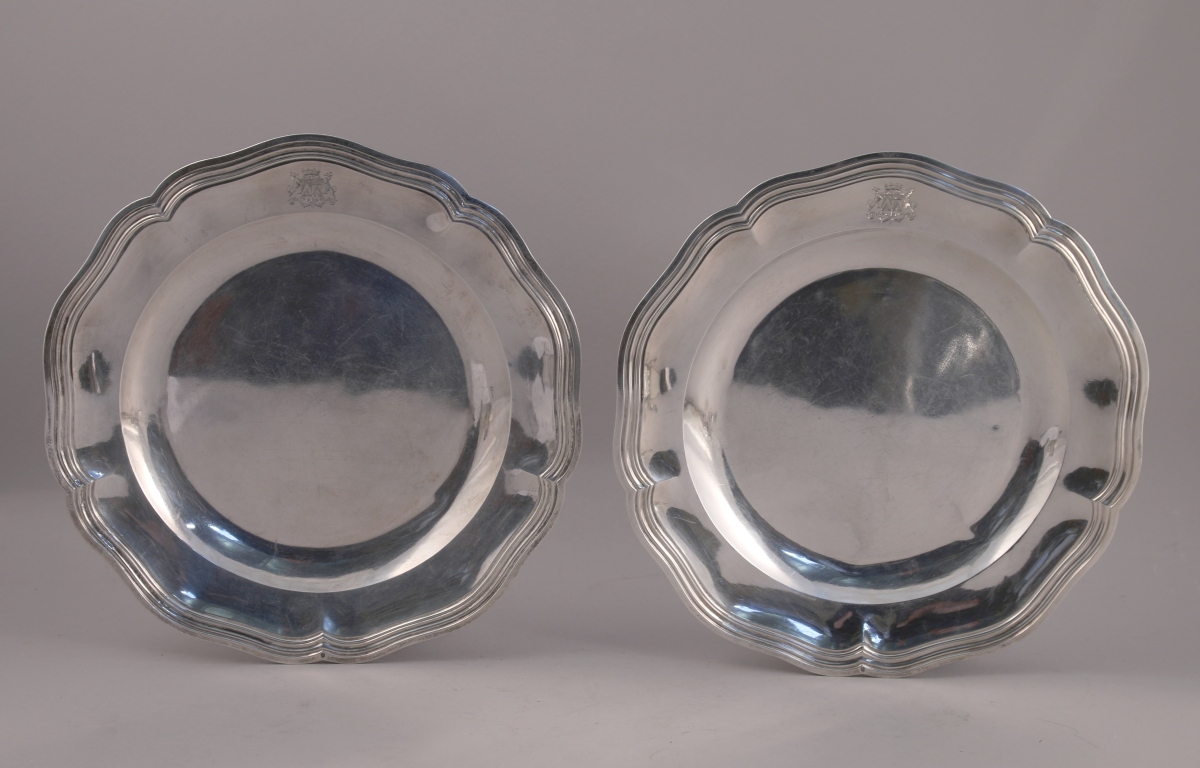 Paire de PLATS de forme ronde en argent. Bordure chantournée à batte-contours. L'aile gravée d'armes d'alliances timbrées d'un tortil de baron et supportées par deux lévriers.