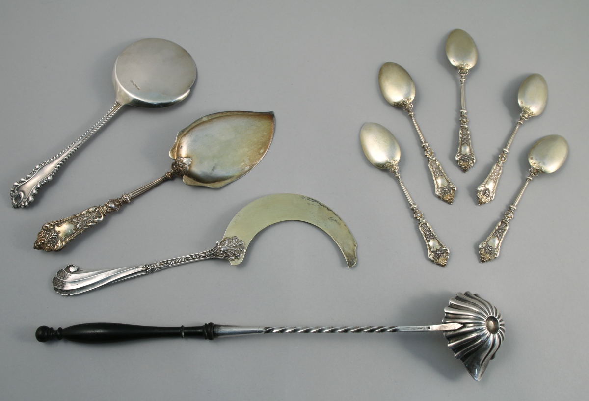 - PELLE à PETITS FOURS et ses CINQ CUILLÈRES À CAFÉ, la spatule très finement ciselée d'un mascaron bachique dans un décor de ferroneries, coquilles, enroulements et acanthes stylisées. Le cuilleron orné de motifs floraux. Travail étranger de style Louis XIV, seconde moitié du XIXe. Poids: 242 g.