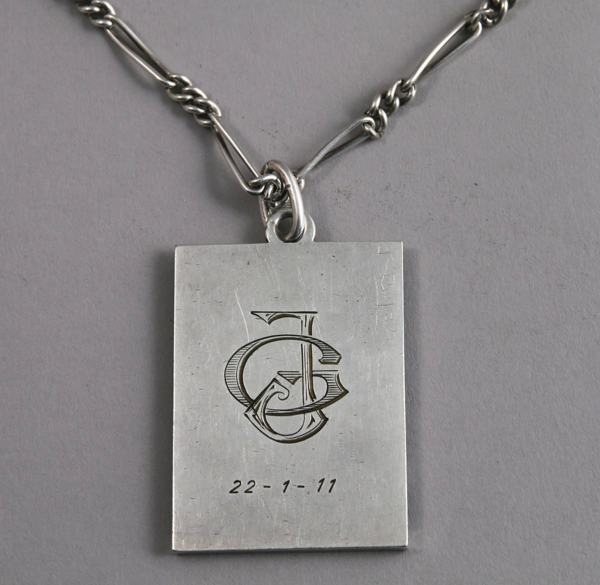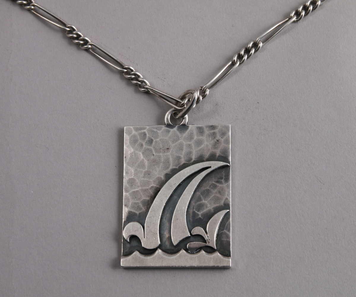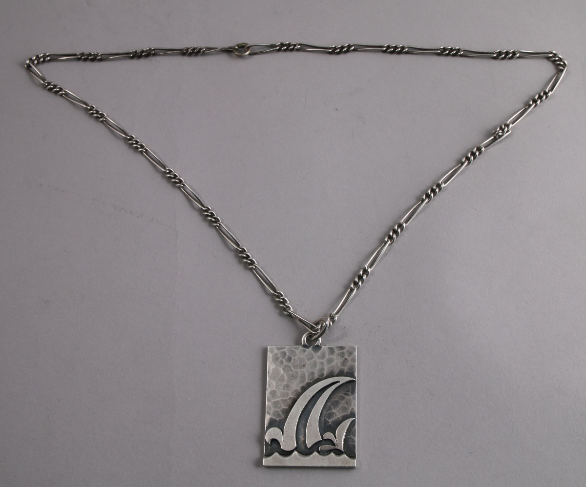 Haut. 5,4, Larg. 4 cm. Avec une chaîne en métal argenté.
