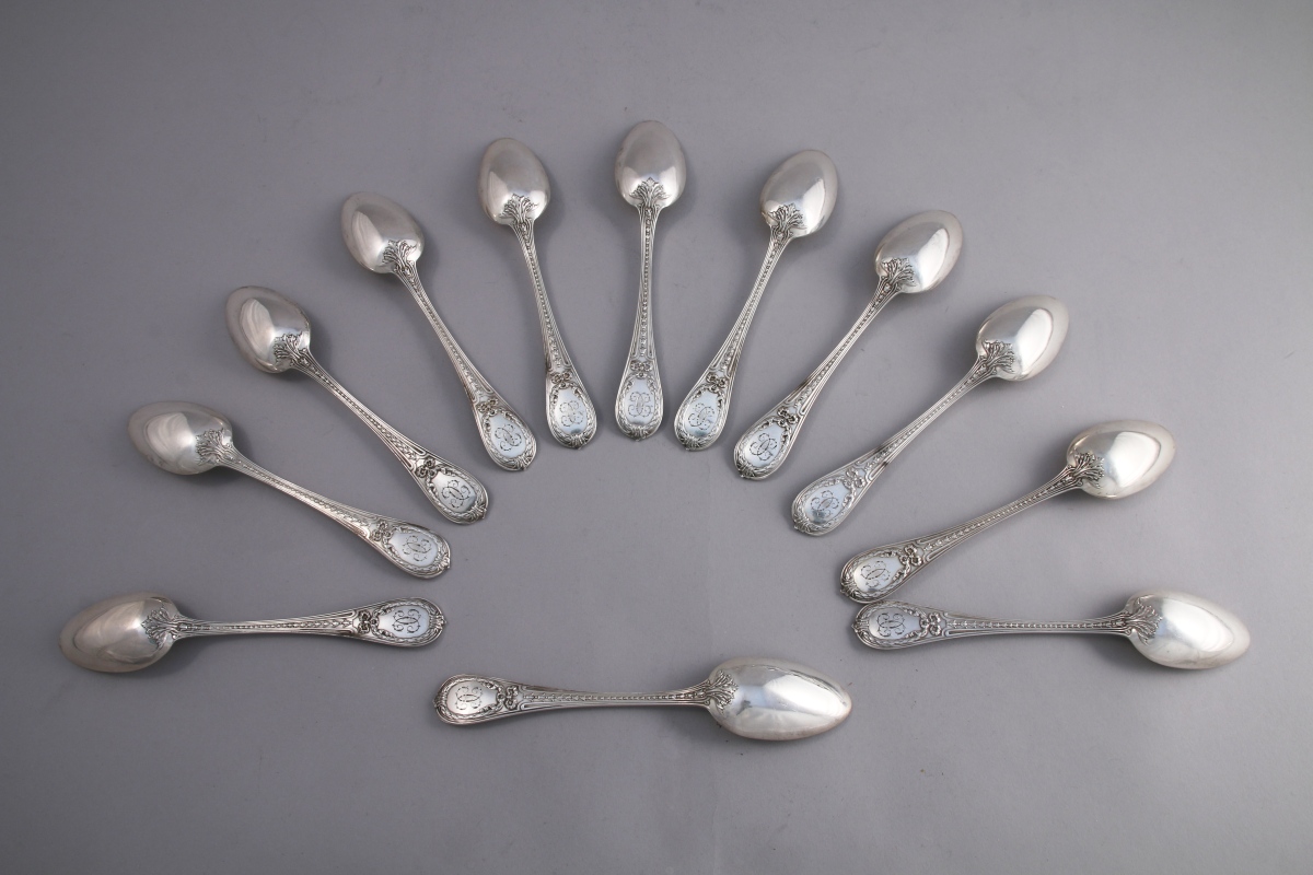 Suite de 12 CUILLÈRES à ENTREMETS en argent, à riche décor d'un culot d'acanthe, fleurons et ruban noué retenant une couronne de laurier. Monogramme "CC".