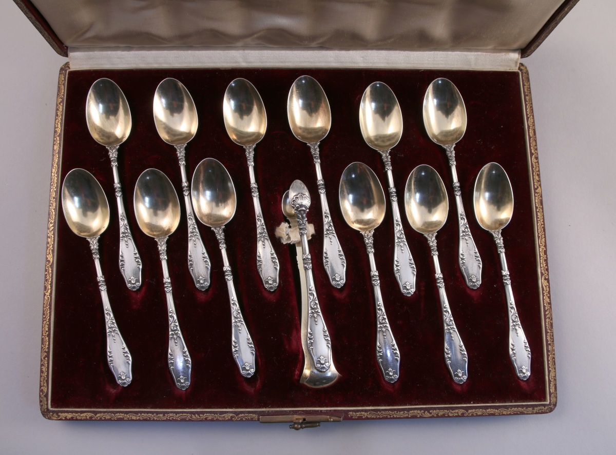 Suite de 12 CUILLÈRES à CAFÉ et PINCE à sucre en argent et vermeil à décor de palmettes, acanthes et enroulements feuillagés.