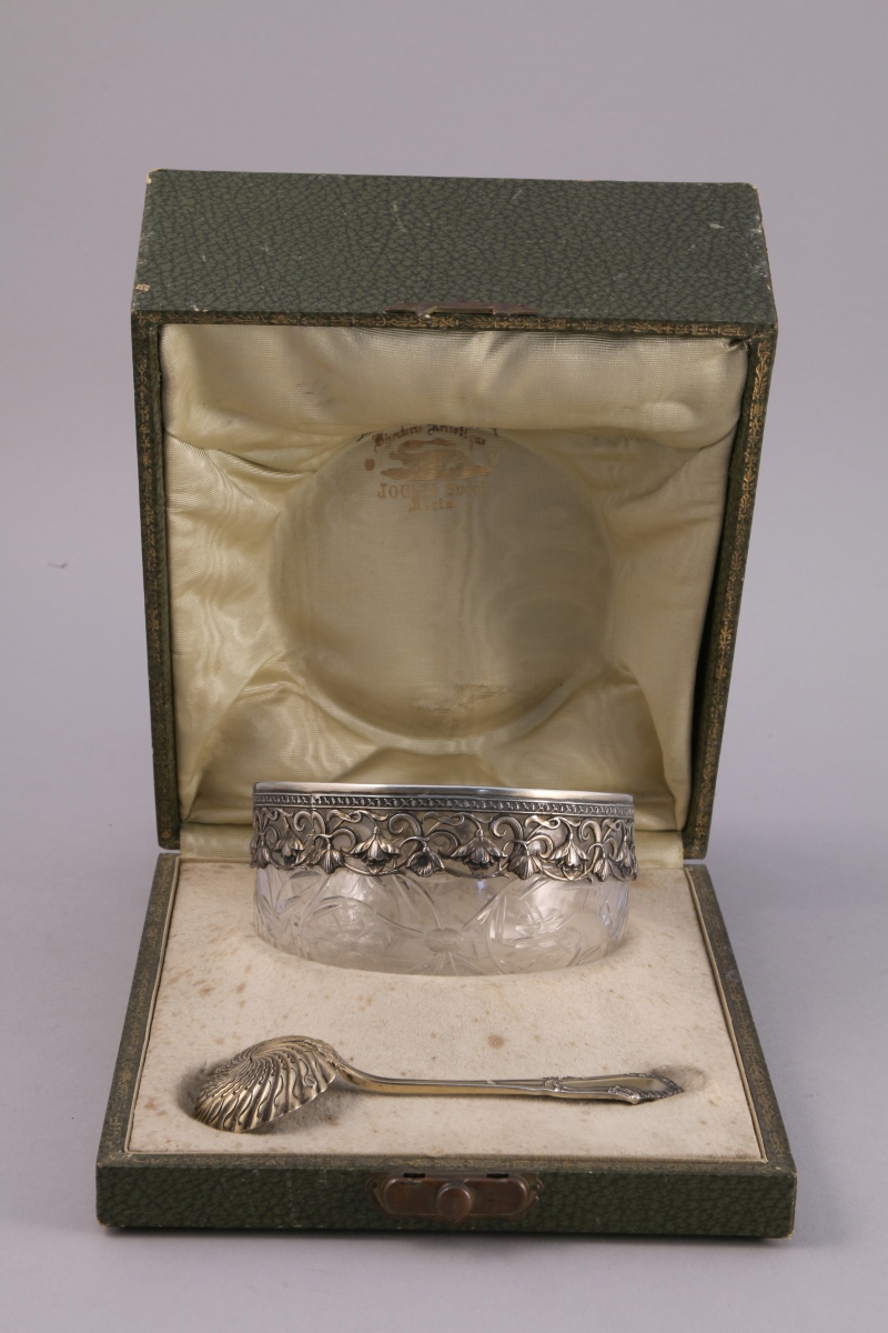 SUCRIER en cristal taillé, cerclé d'une guirlande de fleurs en argent dans un écrin avec une CUILLÈRE À SAUPOUDRER en argent de style Rocaille.