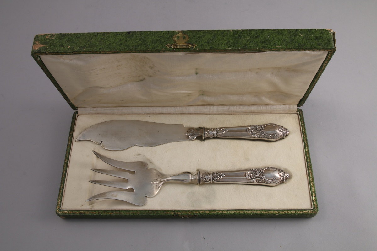 JOINT: FOURCHETTE et COUTEAU de SERVICE à poisson en argent fourré. Lame et fourchon en métal argenté. Fin XIXe, début XXe.