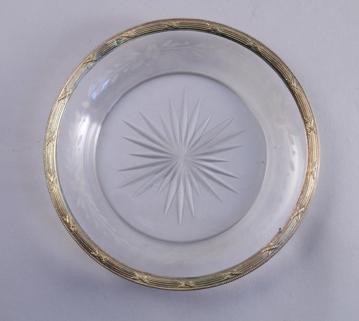 Suite de 12 DESSOUS de CARAFE en verre taillé d'une étoile et de motifs floraux. L'aile cerclée de vermeil à décor de joncs rubannés. Écrin monogrammé "BBL" sous une couronne comtale.