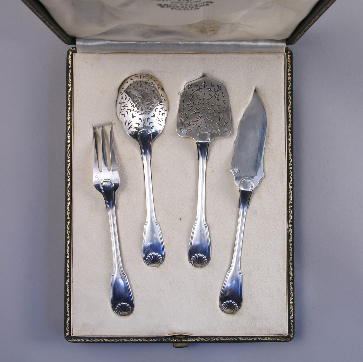 - SERVICE à HORS D'OEUVRE, quatre pièces,modèle filet-coquille. Il se compose d'une fourchette à piquer, d'une cuillère à olives, d'une pelle à petits fours et d'un couteau à beurre. Poinçon Minerve, style XVIIIe, fin XIXe, début XXe. Poids: 125 g. Écrin.