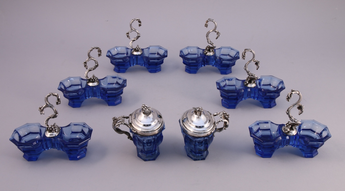 ENSEMBLE de 6 SALIÈRES DOUBLES et 2 MOUTARDIERS en argent, les godets en verre bleu à pans. La prise des salières et l'anse des moutardiers adoptent la forme d'un pampre de vigne. Le fretel figure une grappe de raisin posée sur une feuille.