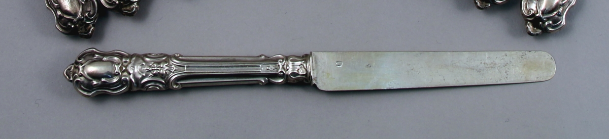 Suite de 20 COUTEAUX À FRUITS. Manches en argent fourré à riche décor d'agrafes, d'enroulements et d'un mascaron cornu. Monogrammés "HR".