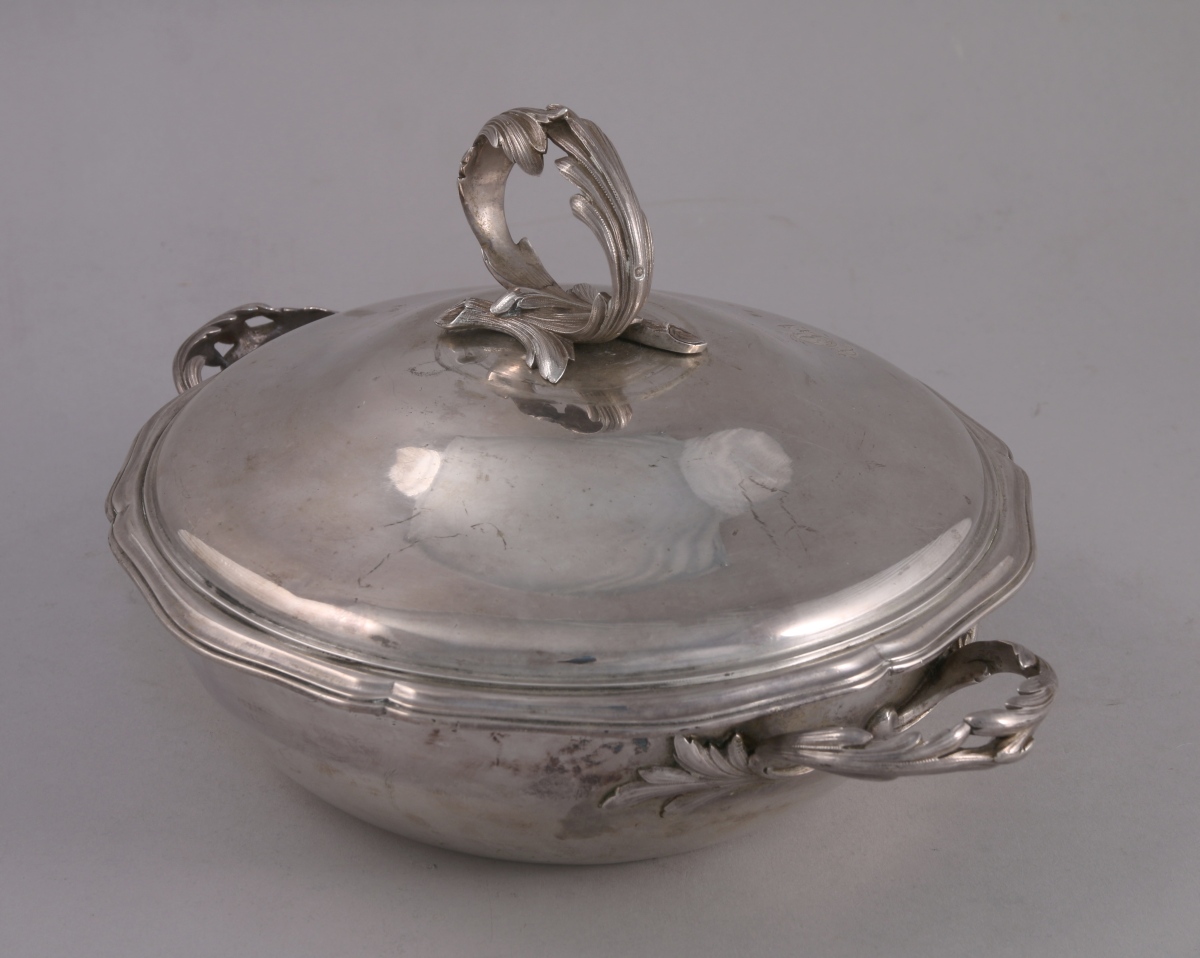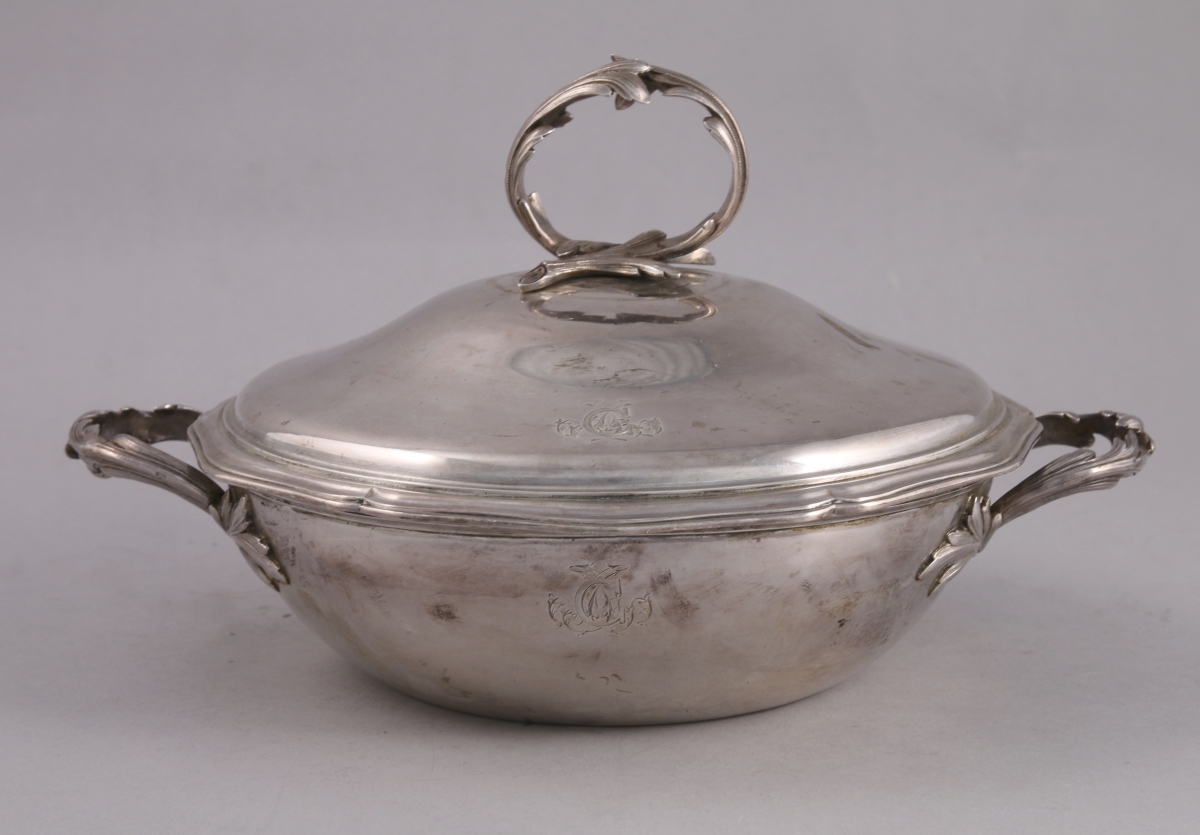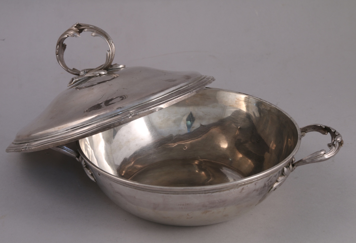 LÉGUMIER en argent, le couvercle à battes-contours sommé d'une prise figurant deux palmes réunies. Le corps à anses latérales au même motif. Monogramme "ACA".