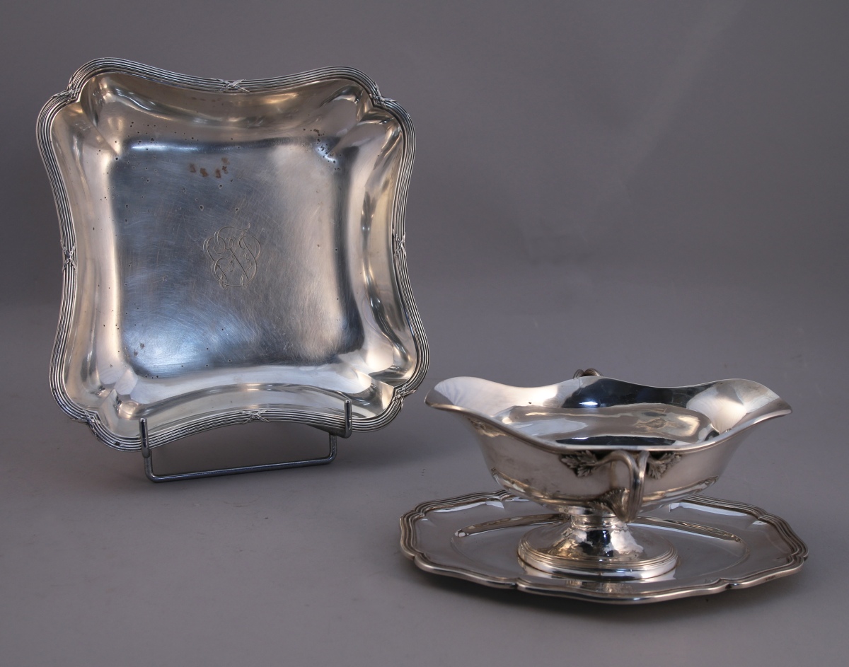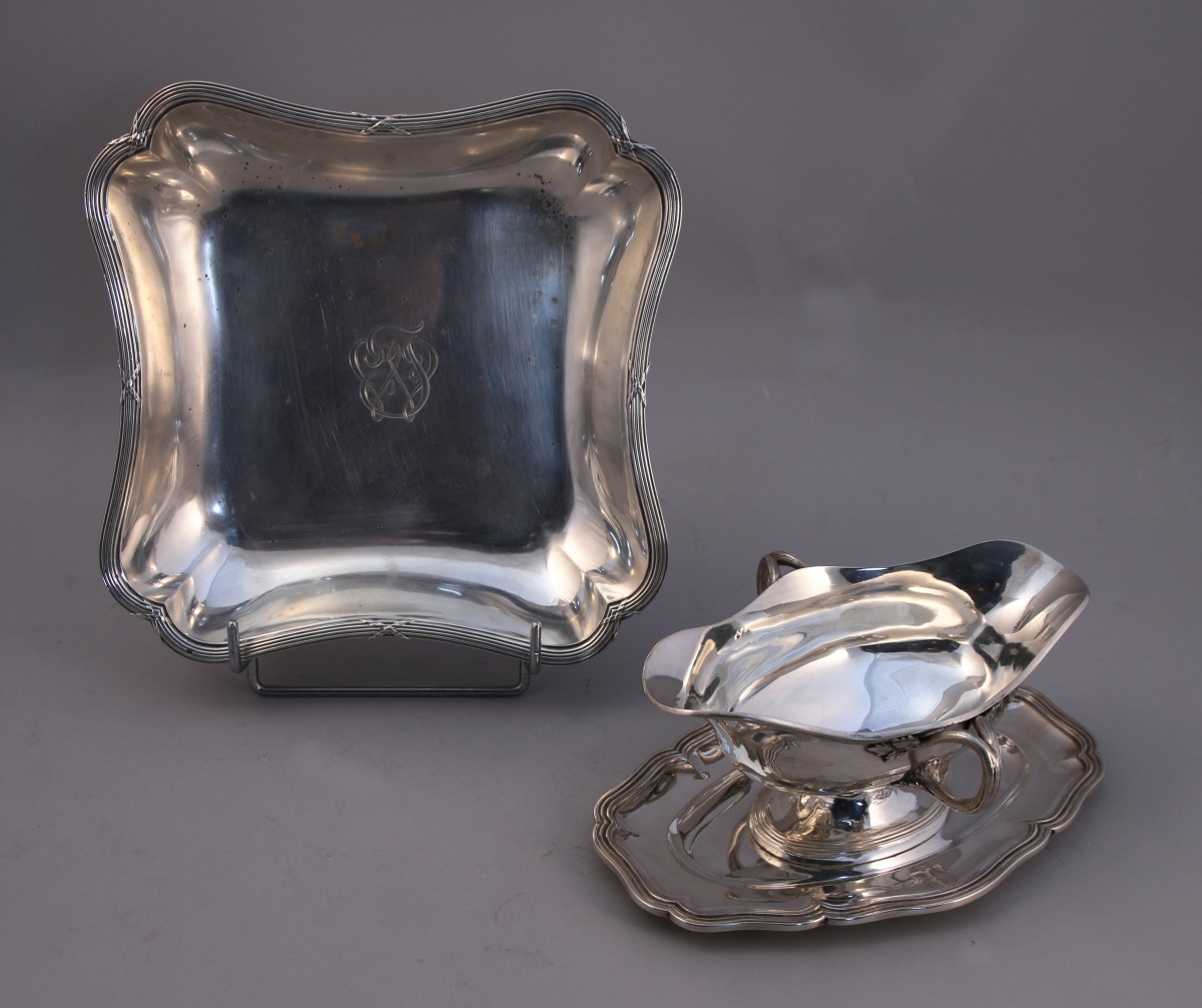 - SAUCIÈRE et son dormant. Bordures à battes-contours. Récipient à bords chantournés reposant sur un piédouche. Anses figurant un rameau à attaches feuillagées. Le dormant monogrammé "JT". Poinçon Minerve, style Louis XV, fin XIXe, début XXe. Haut. 10, Long. 23,5 cm. Poids: 510 g. (restauration au piédouche)