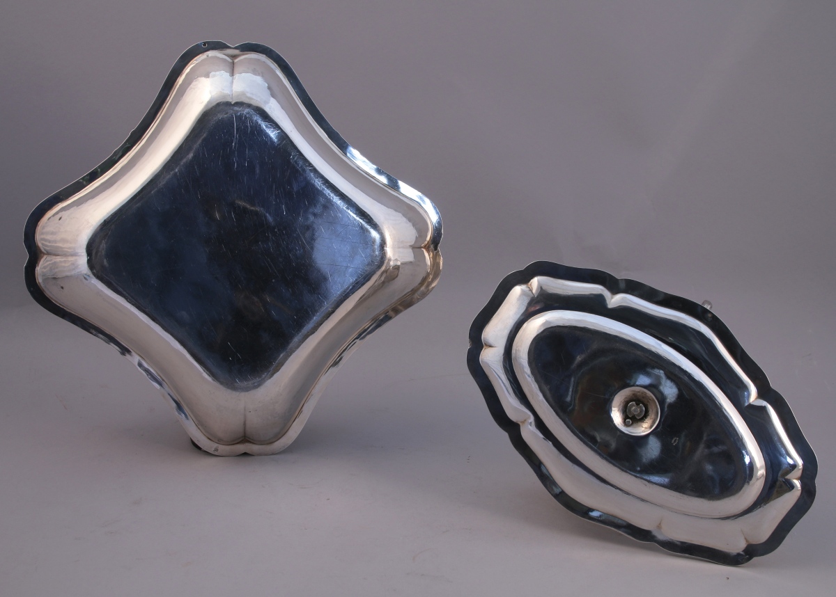 - PLAT creux adoptant la forme d'un carré curviligne. Bordures ornées de joncs rubanés. Le fond du bassin monogrammé "JW". Poinçon Minerve, style Louis XVI, fin XIXe, début XXe. Haut. 4,5, Larg. 25 cm. Poids: 620 g.