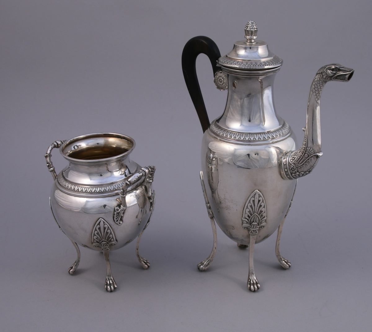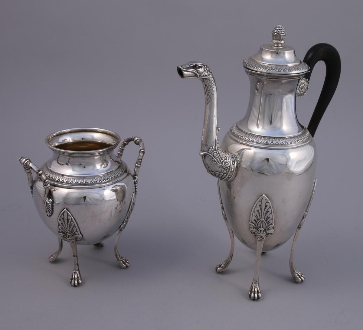 Partie de SERVICE À CAFÉ, 2 PIÈCES. Il se compose d'une CAFETIÈRE et d'un SUCRIER en argent. Panse de forme ovoïde reposant sur trois pieds griffe à large attache en palmette. Haut col étranglé souligné d'une frise de feuilles de laurier en rappel au bord du couvercle. Cafetière: bec verseuseur à tête de cygne, fretel en graine. Anse en bois noirci, l'attache haute en fleuron, la basse à masque féminin. Les anses latérales du sucrier feuillagées à attaches palmette.