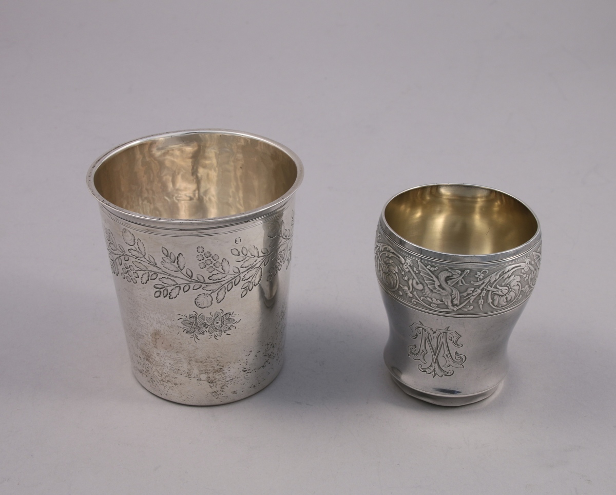 - TIMBALE tronconique à décor circulaire de branchages fleuris. Poinçon Minerve, Milieu du XIXe. Haut. 9, Diam. 8,5 cm. Poids: 90 g.