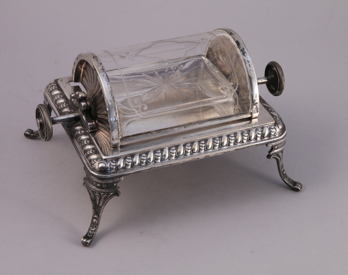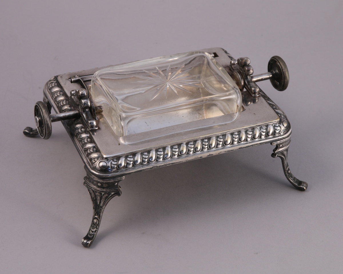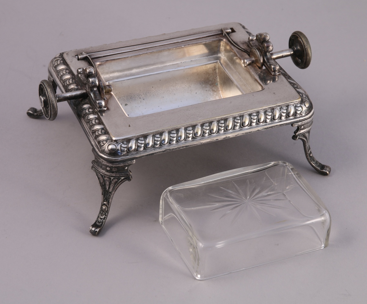 BEURRIER en métal argenté, de style XVIIIe. Couvercles en cristal taillé dont l'un pivotant.