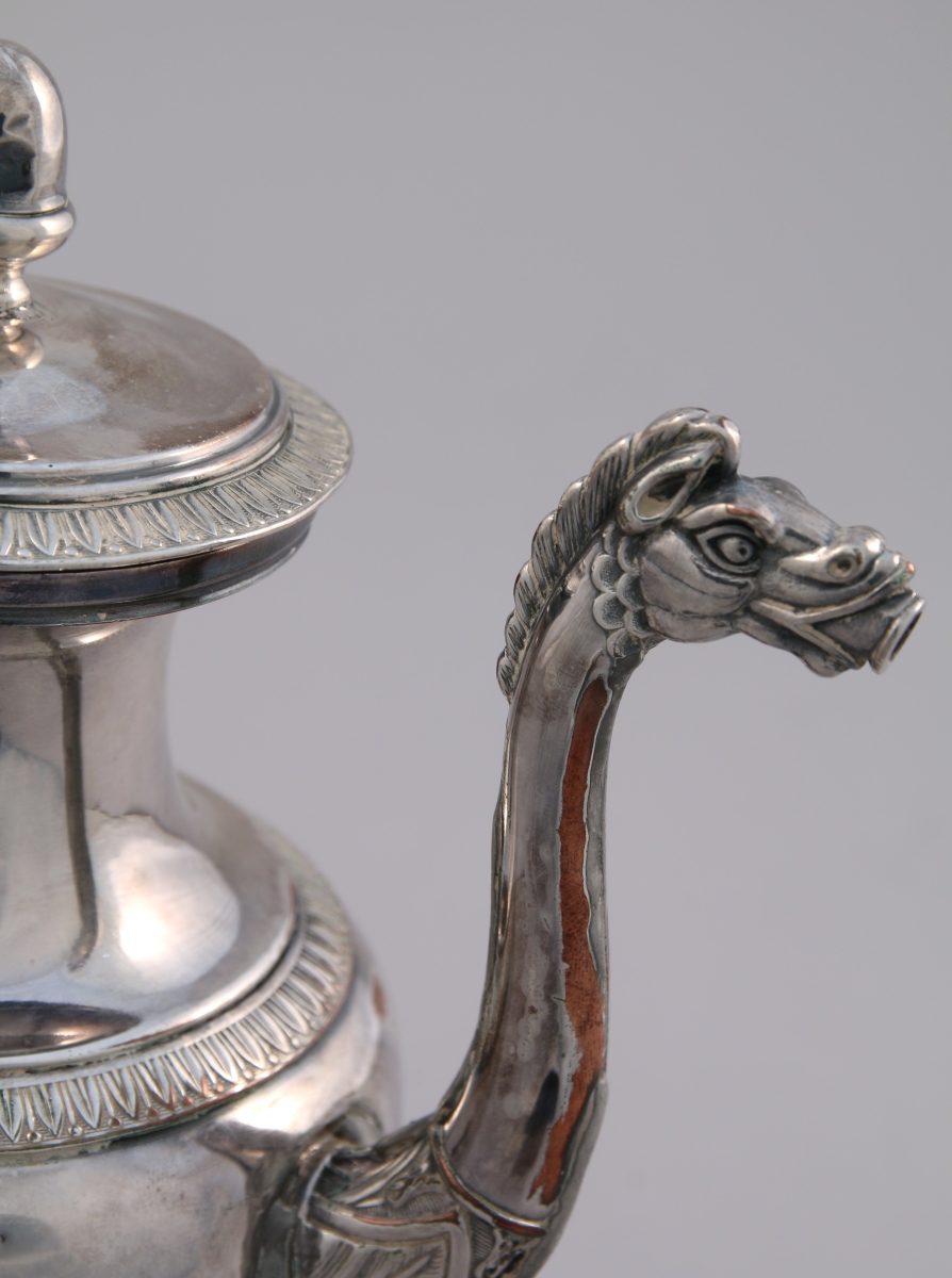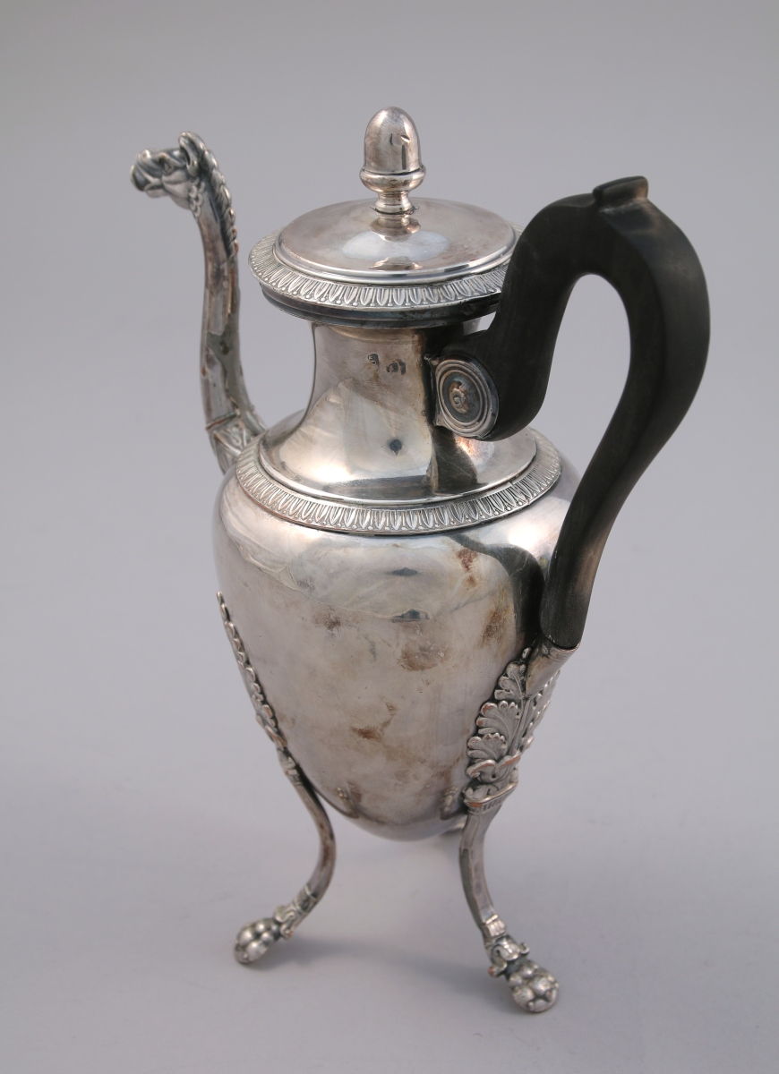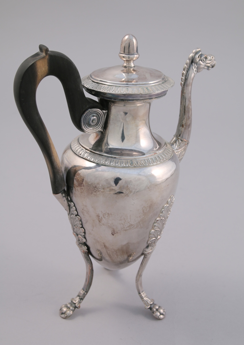 Petite CAFETIÈRE en métal argenté. Panse de forme ovoïde reposant sur trois pieds griffe à large attache en feuille d'acanthe. Bec verseuseur à tête de cheval. Haut col étranglé souligné d'une frise de feuilles d'eau au bord du couvercle. Fretel en gland. Anse en bois noirci.