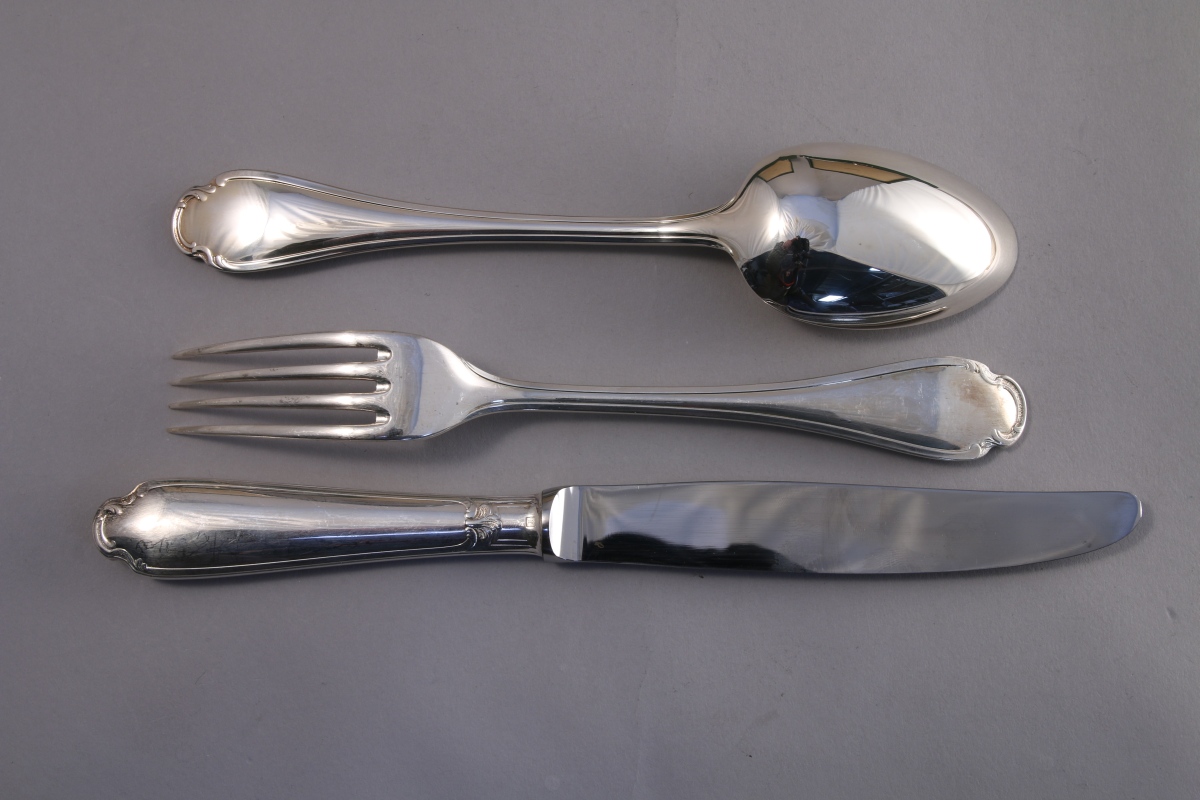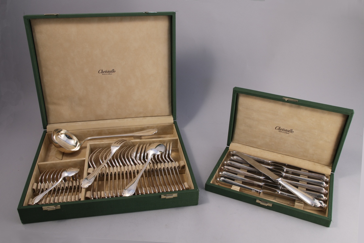 CHRISTOFLE. MÉNAGÈRE en métal argenté, 49 pièces, modèle filet-contour agrémenté d'acanthes stylisées. Bords incurvés. Elle se compose de 12 couverts, 12 grands couteaux, 12 cuillères à café et une louche. Dans ses deux écrins verts.