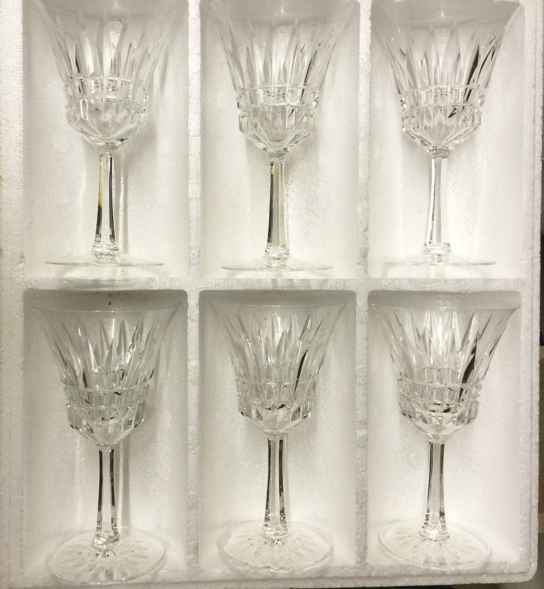 VILLEROY et BOCH. Service de 47 verres en cristal, modèle "ROYAL", comprenant: 12 verres à eau (Haut. 16,5 cm), 12 verres à vin rouge (Haut. 15 cm), 12 verres à vins blanc (Haut. 12,5 cm) et 11 flutes à Champagne (Haut. 17 cm). Dans leurs cartons.