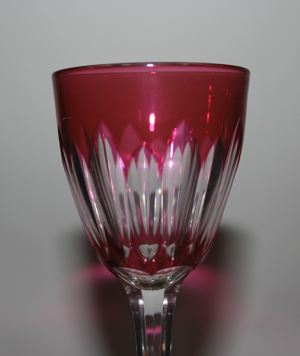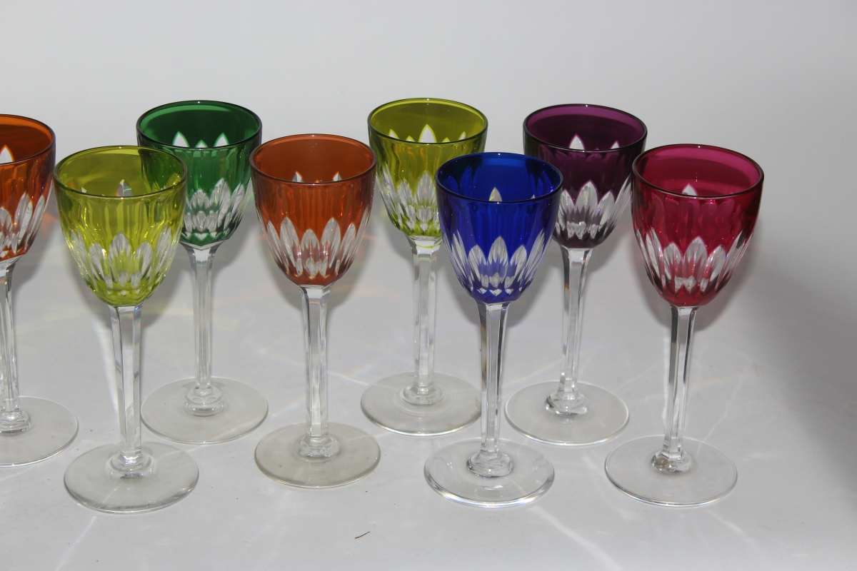 BACCARAT. 12 VERRES à ROEMERS modèle VERONE en cristal double couche au pied et panse taillés, de six couleurs différentes: 3 jaunes, 1 violet, 2 oranges, 2 roses et 2 bleus.