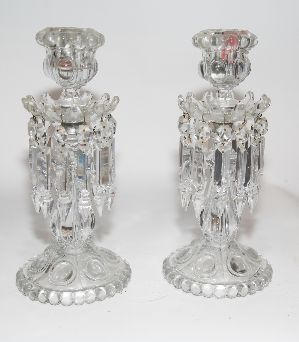 BACCARAT. Paire de FLAMBEAUX "MÉDAILLON" en cristal à décor de perles, godrons et 12 pendeloques de cristal taillé. Signés.