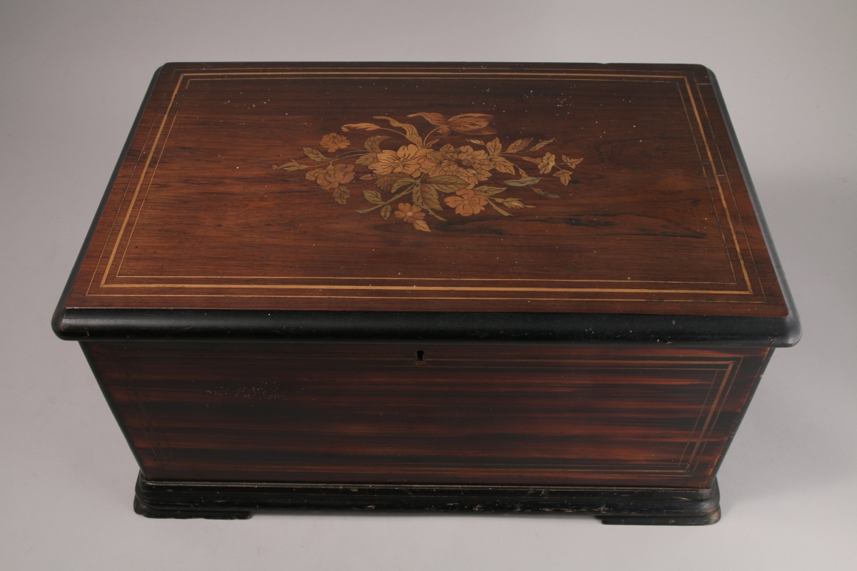 Rare BOITE à MUSIQUE, dite "MUSICAL TEA ROOM" dans une caisse rectangulaire en placage et filets de bois clairs, s'ouvrant par le dessus d'un abattant marqueté d'un bouquet de fleurs, et d'un second abattant vitré. Serrure et clé. Le programme des airs chromolithographié à l'intérieur de l'abattant numéroté "n°15749" ainsi que "n°47563".