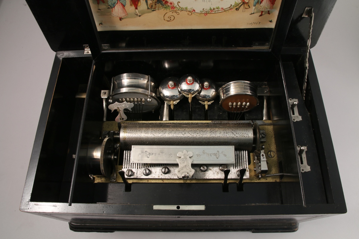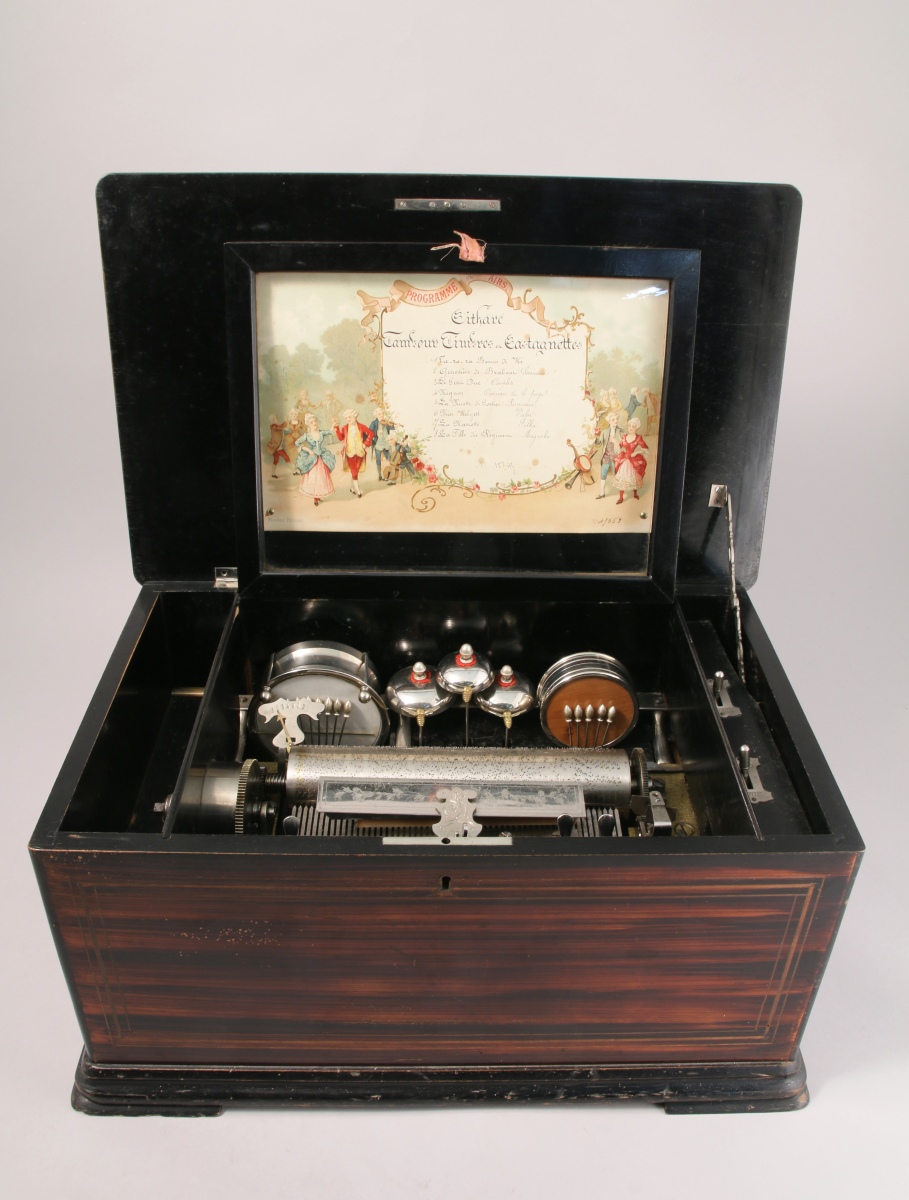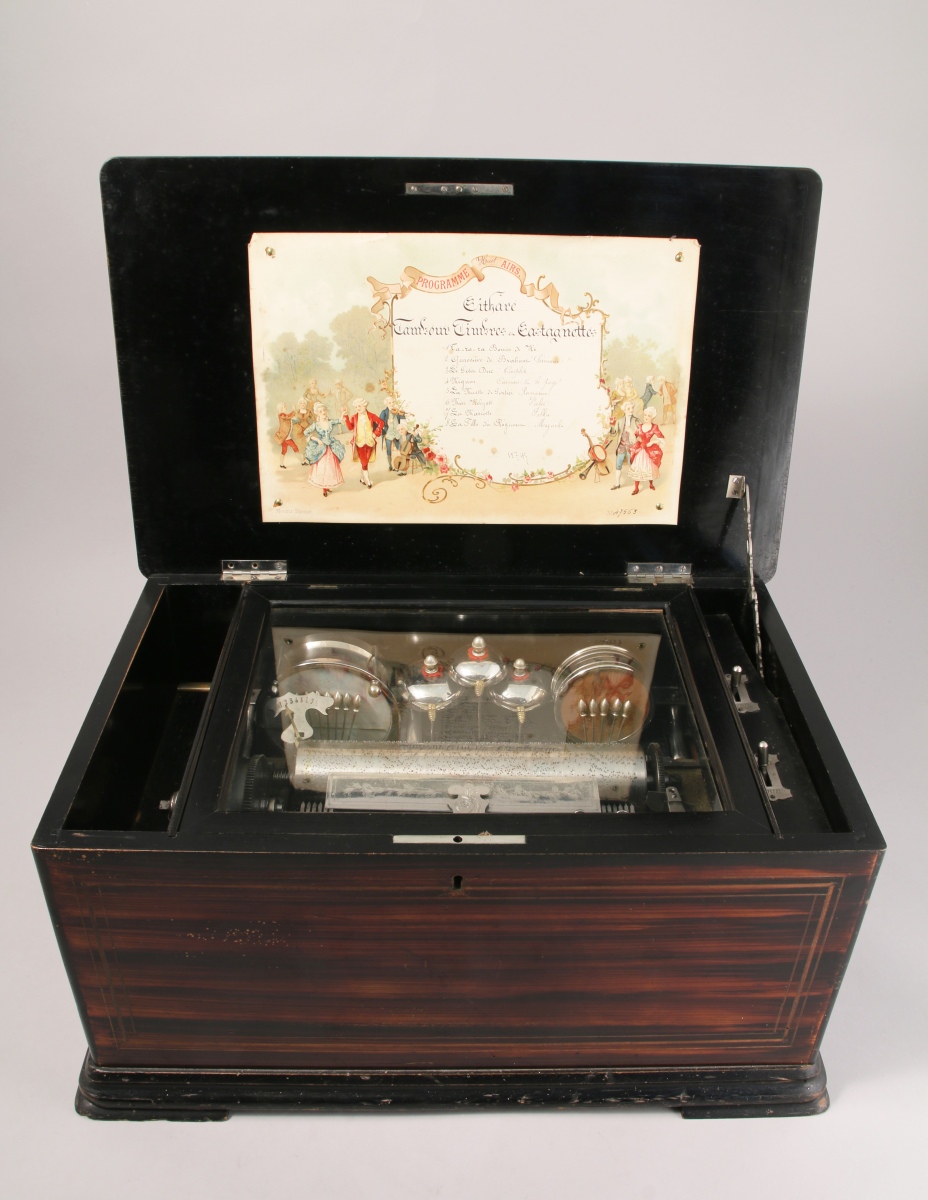 Cartel à 8 airs, cylindre de 23 cm. Clavier de 59 lames. 12 marteaux: tambour et castagnettes, 3 timbres frappés par des abeilles, cithare (zither). Marteaux débrayables. Remontage par manivelle sur le côté gauche.