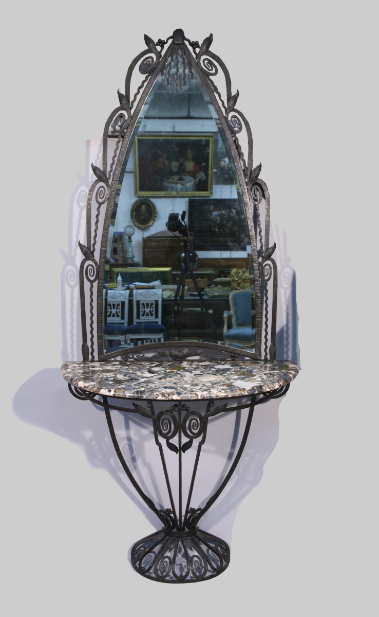 Grande CONSOLE d'APPLIQUE demi-lune et son MIROIR formant psyché de forme concave, en fer forgé. Décor ajouré de feuillages et d'enroulements. Piètement circulaire bombé. La console coiffée d'un marbre brèche.