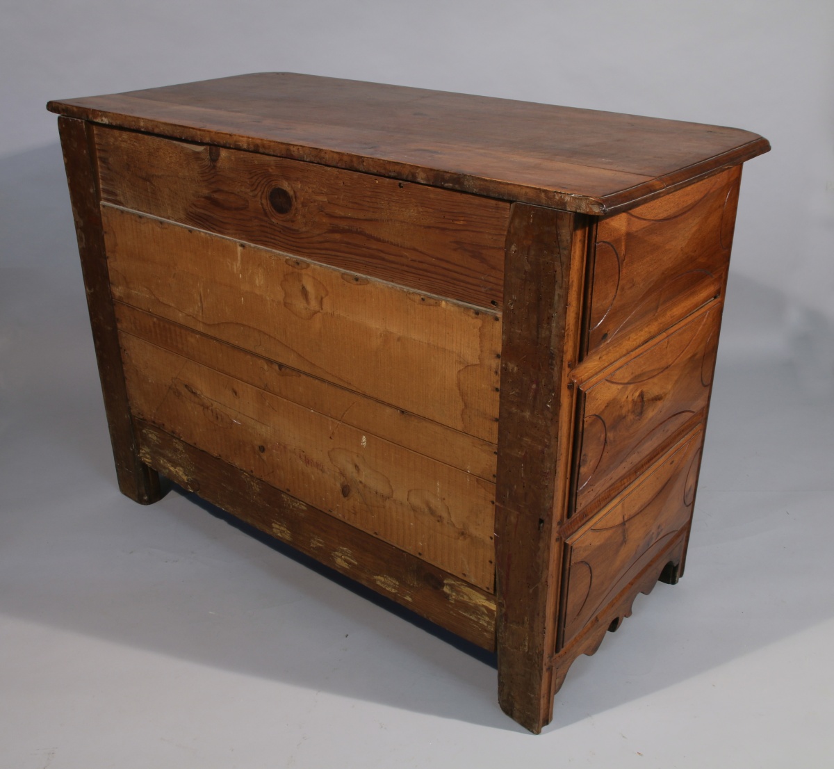 COMMODE de forme rectangulaire en noyer mouluré et sculpté, elle ouvre en façade à trois tiroirs, mains tombantes et entrées de serrure en fer. Traverses basses chantournées