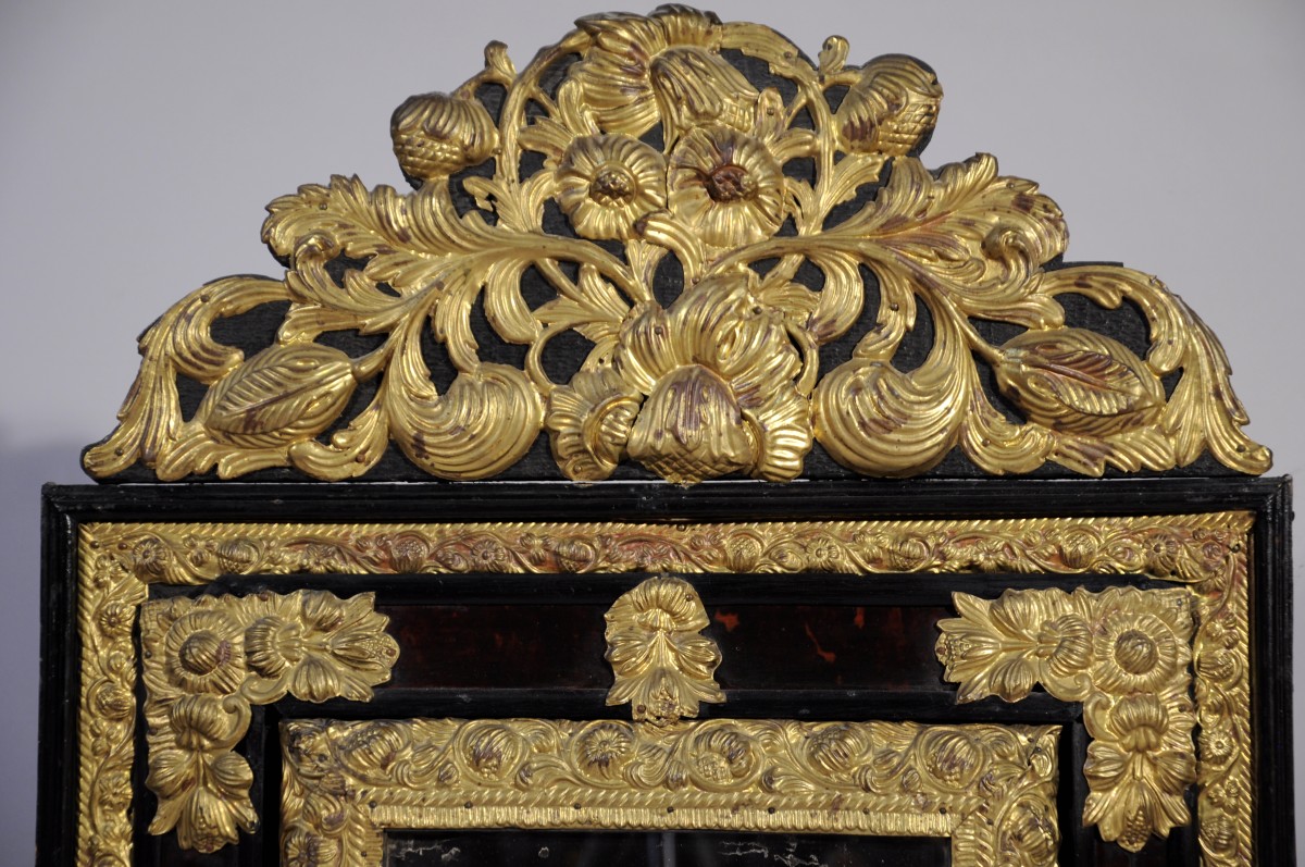 MIROIR à FRONTON de forme rectangulaire à encadrement en placage d'écaille de tortue et bois noirci. Applications de pomponne doré à riche ornementation florale.