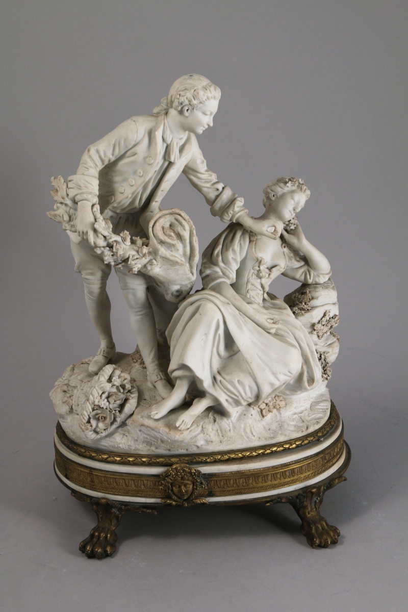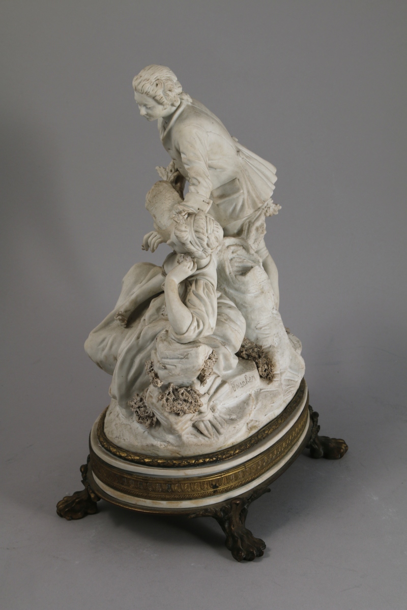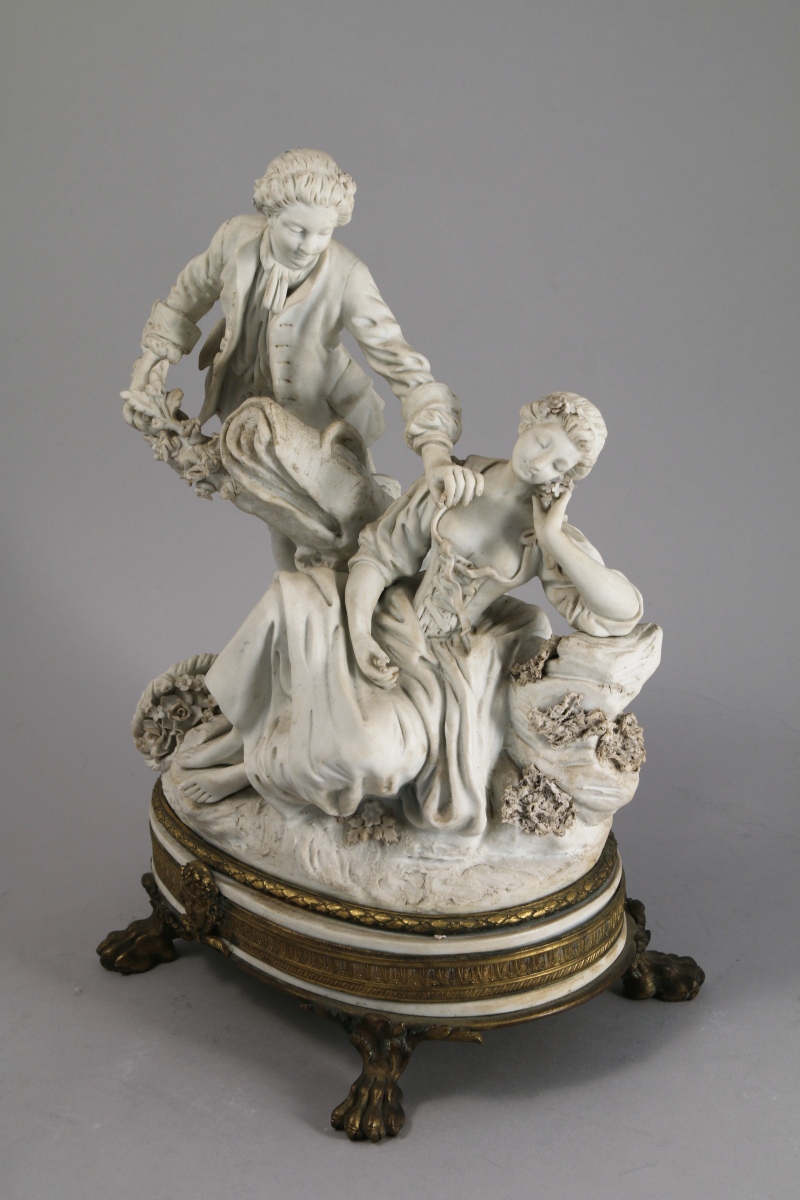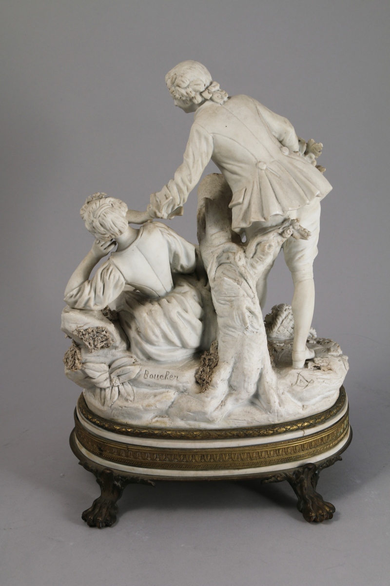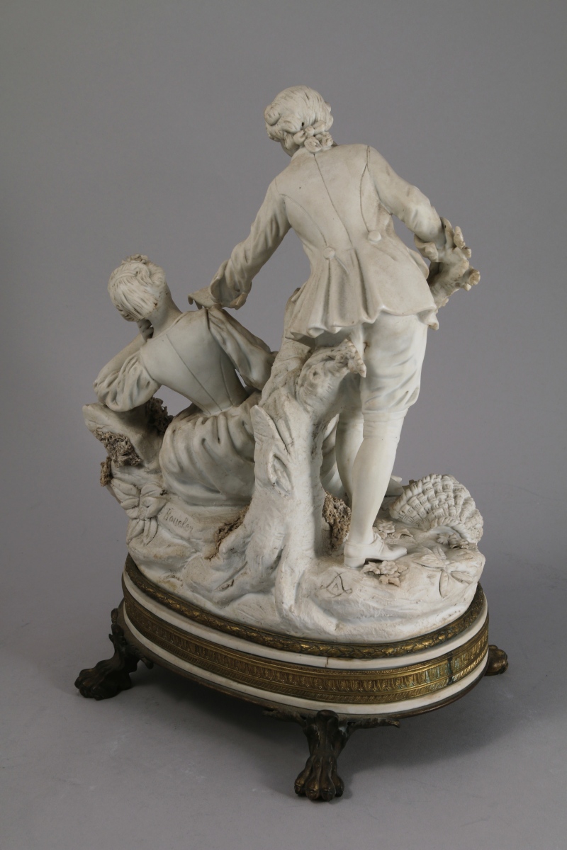 LA BELLE ENDORMIE. Groupe en biscuit figurant un galant homme s'approchant pour fleurir le corsage d'une jeune femme endormie. Signature apocryphe Sèvres, lettre date "A" et "Boucher".