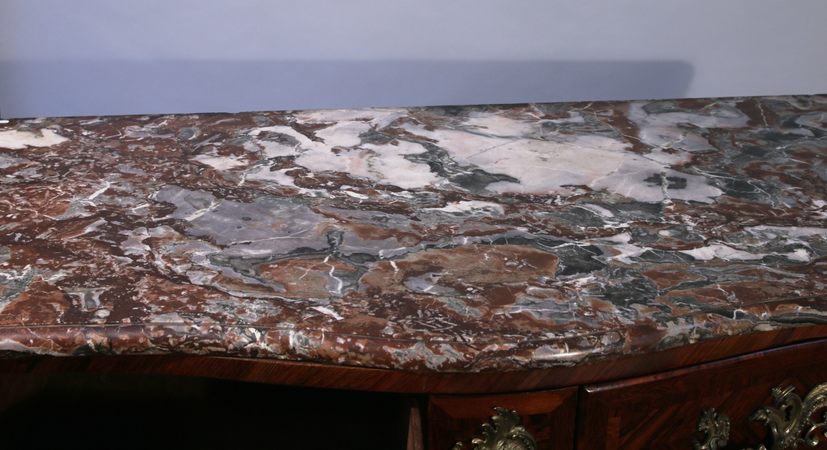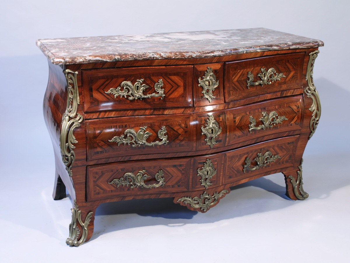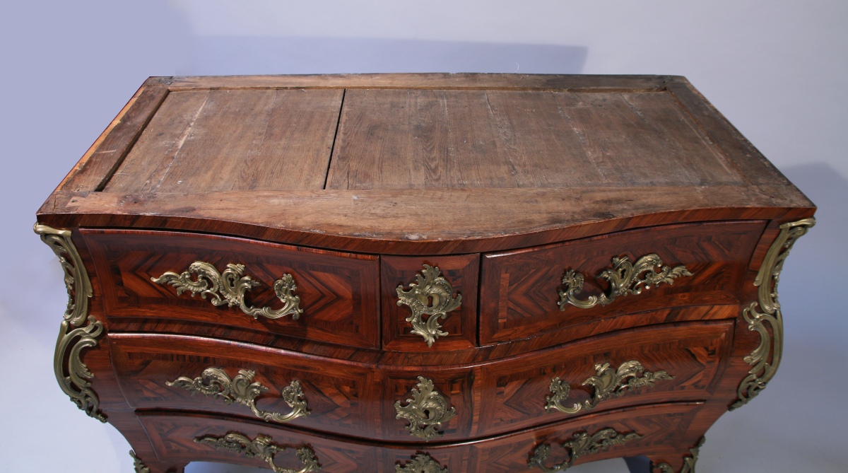 COMMODE TOMBEAU en chêne, fonds de sapin et placage de bois de violette marqueté en frisage géométrique, compartiments et filets. La commode ouvre à cinq tiroirs sur trois rangs dont trois dans la partie supérieure, le tiroir central secret à système. Garniture de bronzes ciselés tels que entrées de serrure, poignées de tirage, chutes, cul de lampe et sabots de style rocaille.