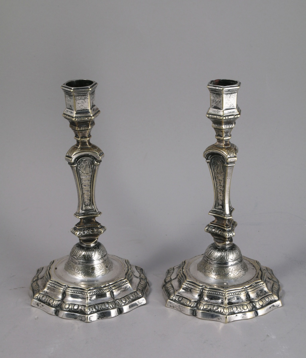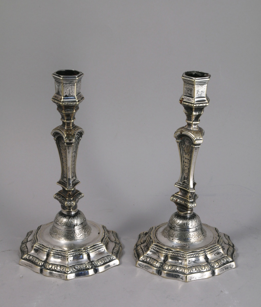 PAIRE de FLAMBEAUX en bronze argenté et ciselé. La base circulaire à contours chantourné, à doucine fleuronnée soutient le fût à pans coupés ornés de coquilles. Binet hexagonal à décor de guirlandes de fleurs