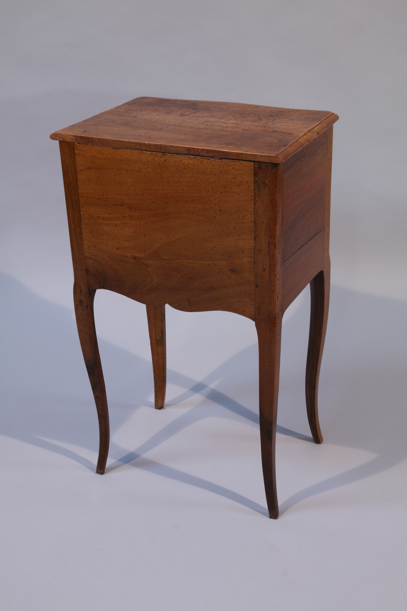 TABLE VOLANTE de forme rectangulaire en noyer, ouvrant en façade à trois tiroirs, celui du haut compartimenté formant écritoire. Elle repose sur quatre pieds cambrés.