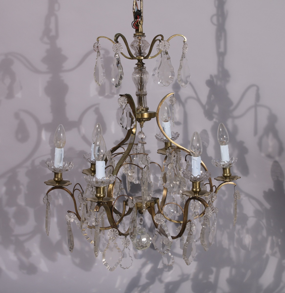 LUSTRE en bronze à six bras de lumière chantournés orné de pampilles en cristal.