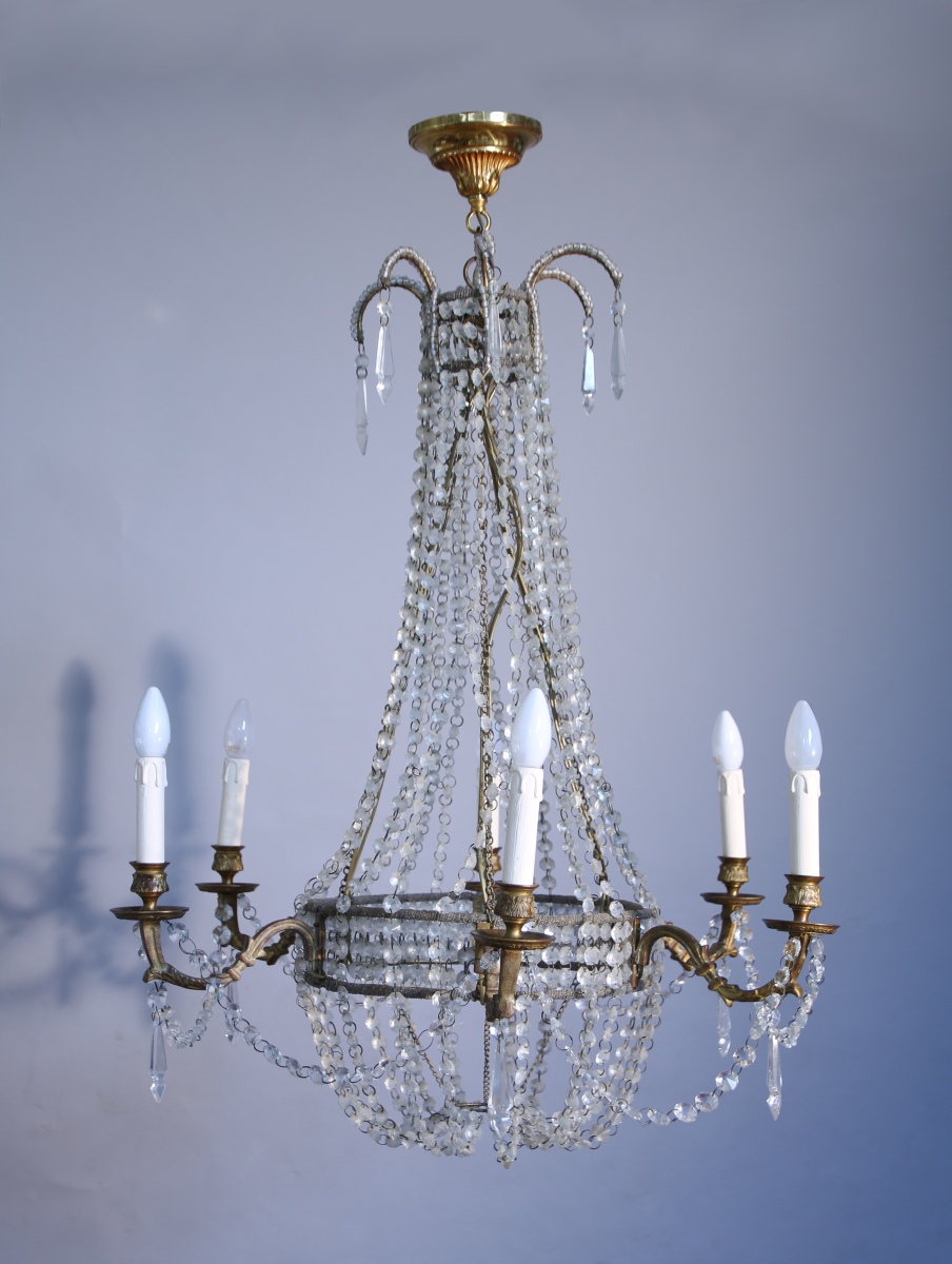 LUSTRE MONTGOLFIÈRE à 6 lumières en cristal soufflé et taillé de chaines, et pendeloques.