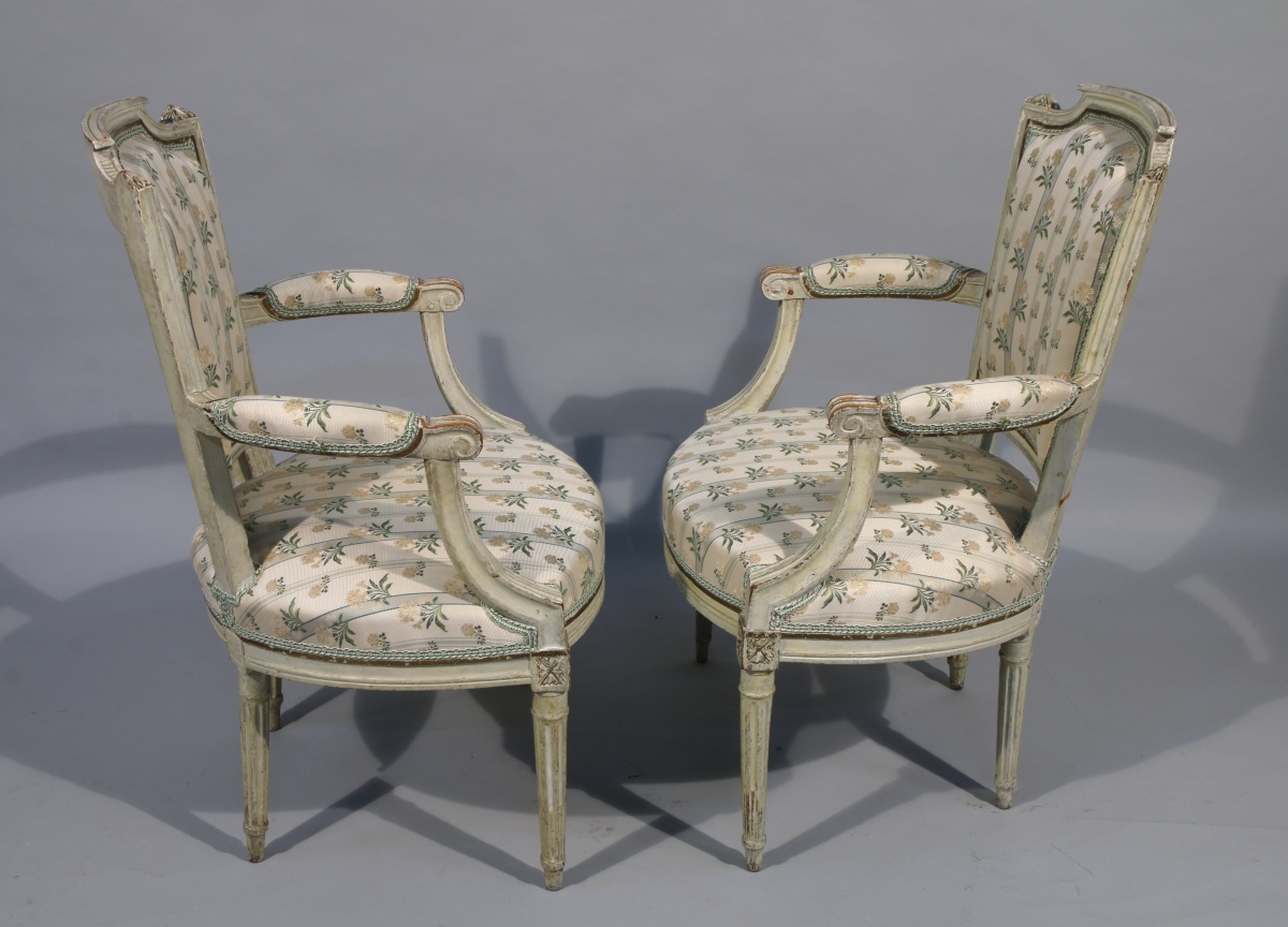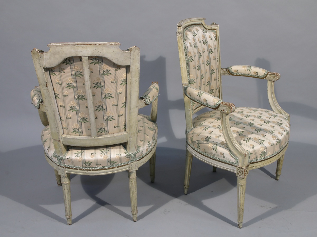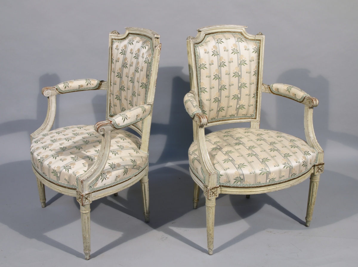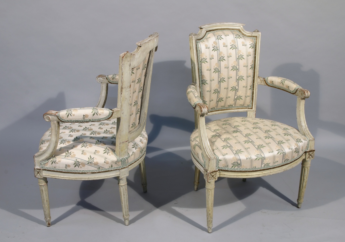 Paire de FAUTEUILS CABRIOLET en bois mouluré et sculpté relaqué crème. Dossier en chapeau de gendarme surmonté de fleurs à l'épaulement. Accotoirs à manchettes et supports d'accotoirs galbés, cannelés et terminés en enroulements. Dés de raccordement à rosaces. Ils reposent sur quatre pieds à section ronde fuselés, cannelés et rudentés.