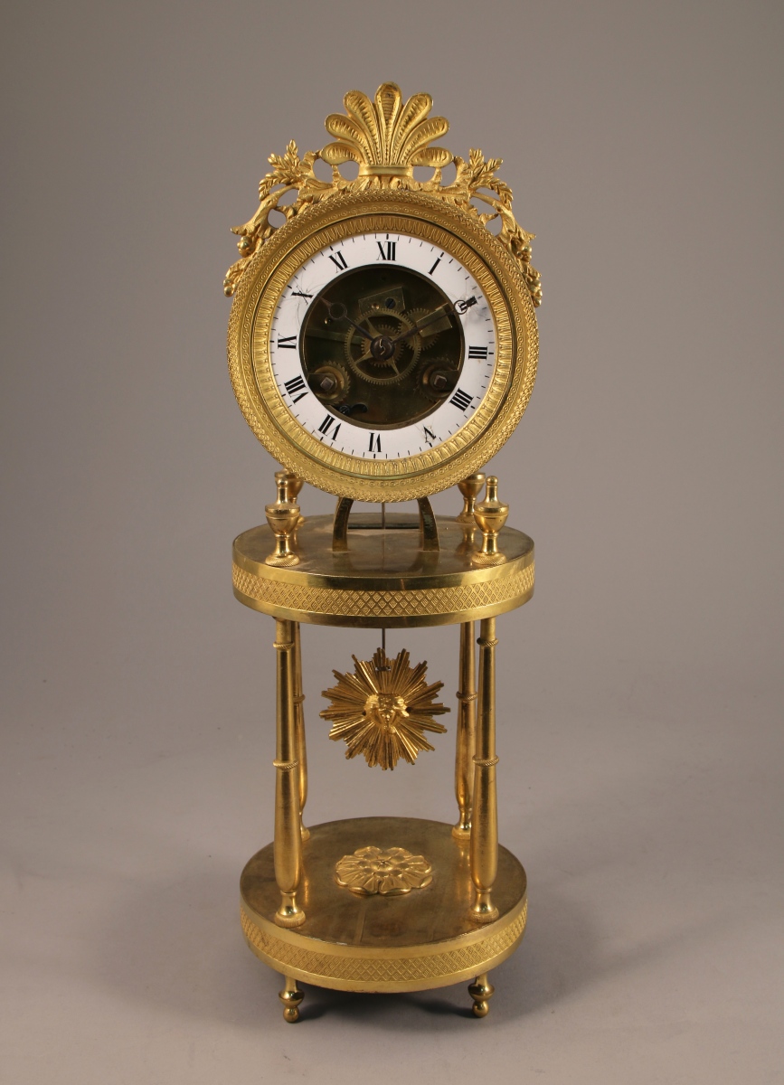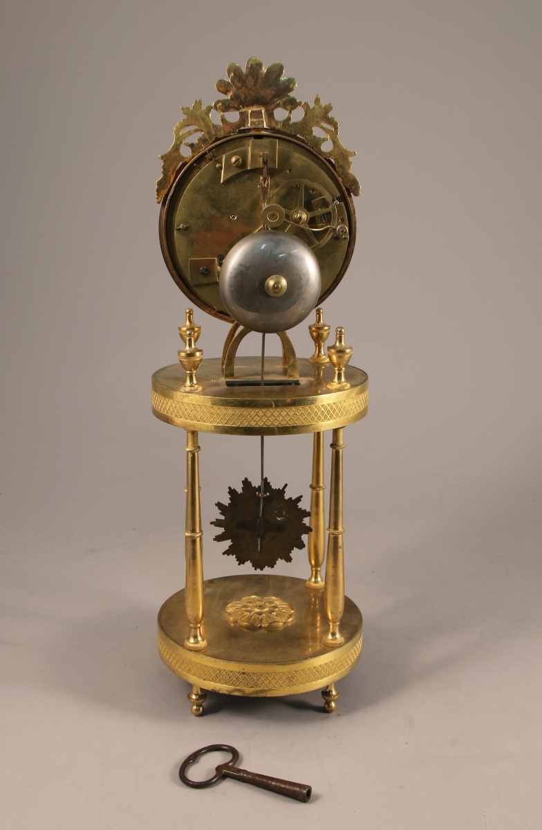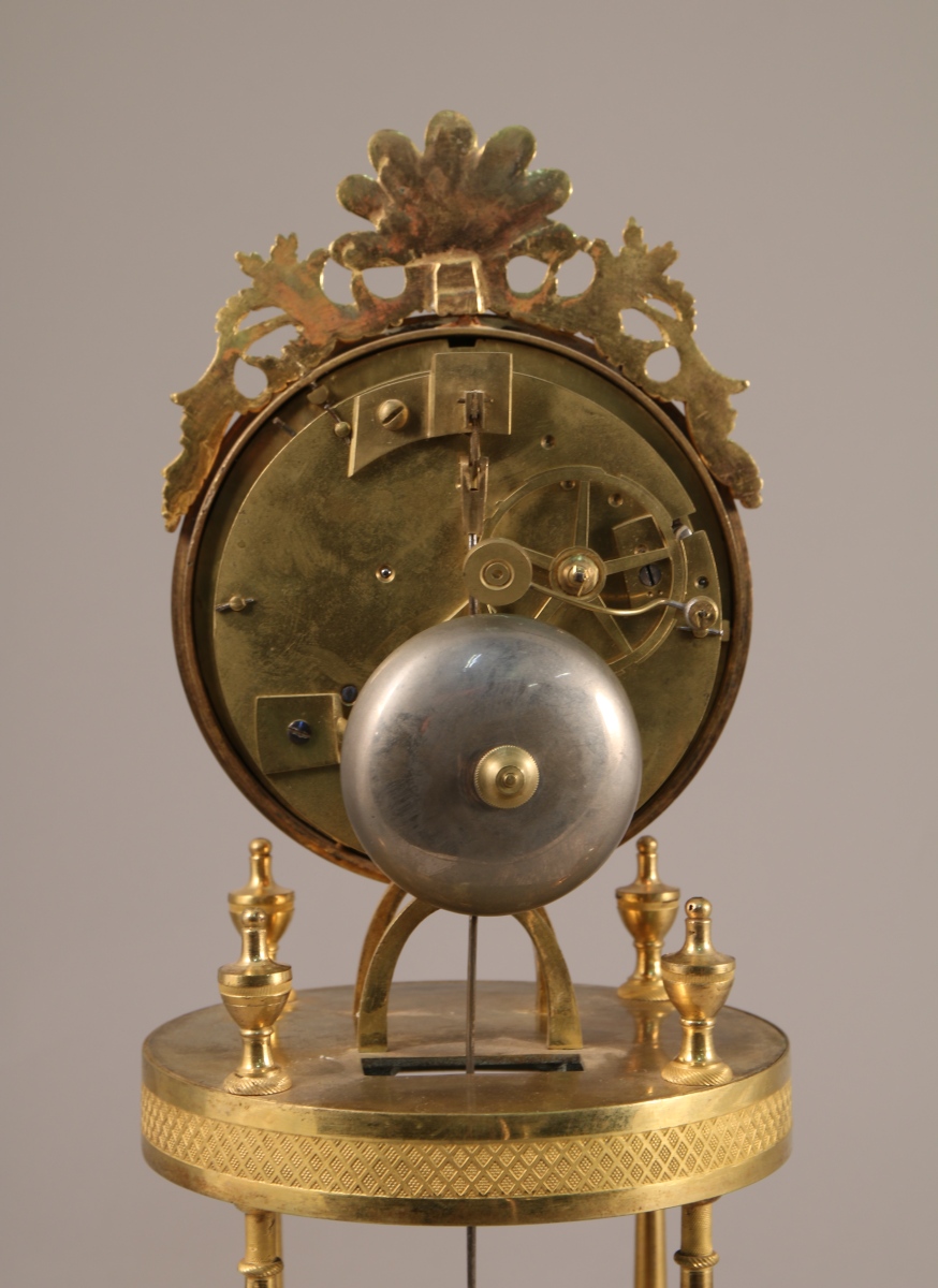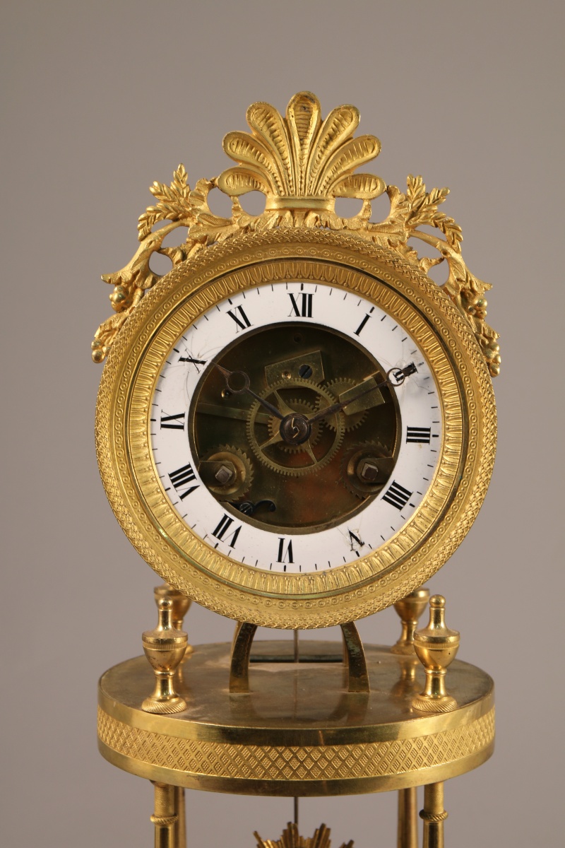 PENDULE dite SQUELETTE en bronze ciselé et doré. Le cadran de forme circulaire à disque émaillé blanc indiquant les heures en chiffres romains. Il est cerclé de laiton orné de frises de lauriers, d'oves et de feuilles d'eau et est sommé d'une palmette flanquée de rinceaux ajourés. Le mouvement repose sur une plateforme discoïdale agrémentée de quatre toupies et soutenue par quatre colonnes en balustre. Base discoïdale agrémentée d'un fleuron central et ciselée de quadrillages. Piètement toupie quadripode. Balancier à masque solaire rayonnant.